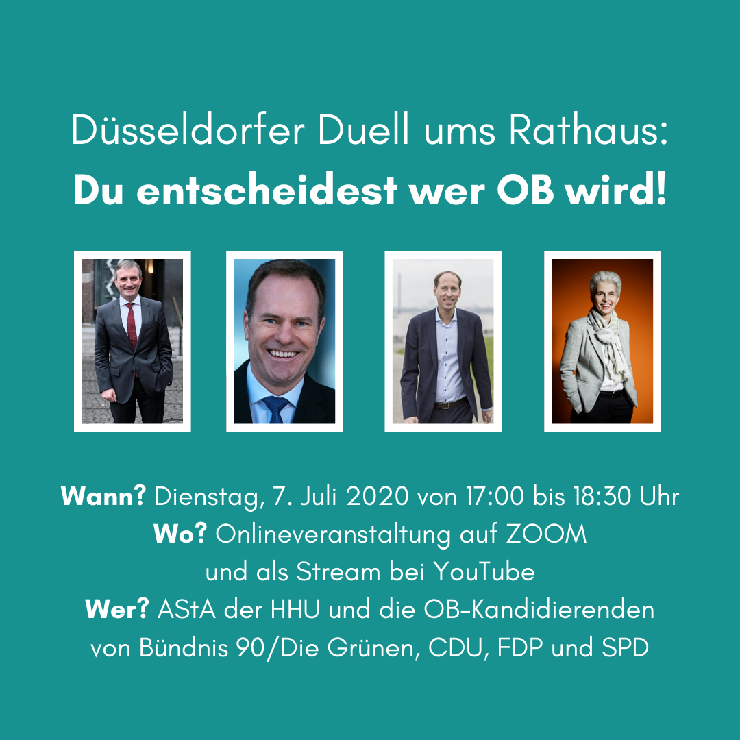 Gerne möchte — der AStA der Heinrich-Heine-Universität Düsseldorf — Sie dazu einladen am 07.07.2020 ihr Düsseldorfer Duell ums Rathaus zu verfolgen. Inhaltlich werden die Kandidierenden Thomas Geisel (SPD), Dr. Stephan Keller (CDU), Stefan Engstfeld (Bündnis 90/ Die Grünen) und Dr. Marie-Agnes Strack-Zimmermann (FDP) mit Fragen rund um das studentische Leben konfrontiert werden, wie bswp. Studentischer Wohnraum und Mietpreise in Düsseldorf, ÖPNV und Anbindung der Universität an die Stadt Düsseldorf, Kulturelle und sportliche Angebot (in) der Stadt für Studierende oder die Nachhaltigkeitsvision für die Stadt Düsseldorf.