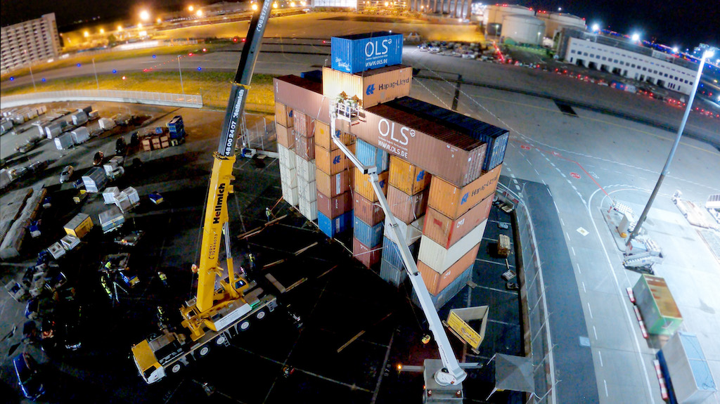 Geschäftiges Treiben: Kräne, Feuerwehr und große Seecontainer nehmen seit einiger Zeit einen Teilbereich der großen Lagerfläche hinter dem Lufthansa Cargo Center am Flughafen Frankfurt ein. Was passiert hier gerade?