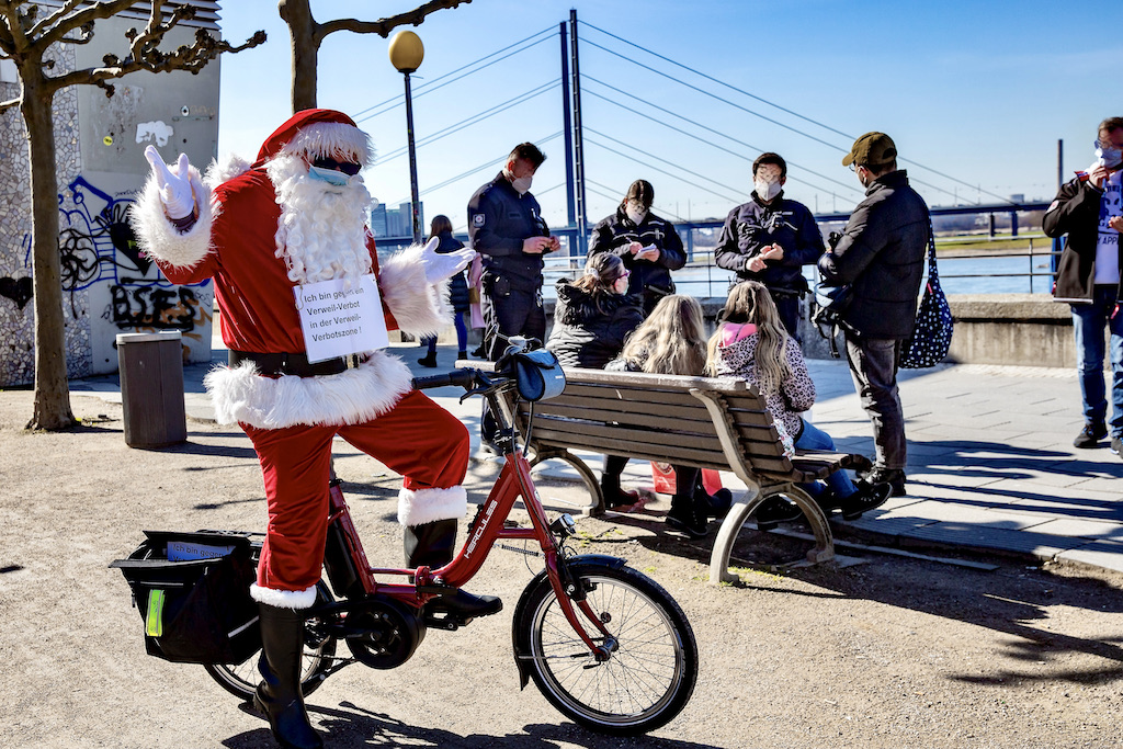 Aber das bei­spiels­weise ältere Men­schen, die am Wochen­ende auf den Bän­ken am Rhein in der Sonne in der fri­schen Luft ver­wei­len, von der Poli­zei oder dem OSD auf­ge­for­dert wer­den dort nicht zu sit­zen, auch nicht Ste­hen­zu­blei­ben, son­dern zügig vor­an­zu­ge­hen und sogar mit einem Buß­geld bestraft wer­den, das fin­det der Weih­nachts­mann gar nicht gut und hält dies für einen gro­ßen, nicht ziel­füh­ren­den Image­scha­den für die Metro­pole Düsseldorf.
