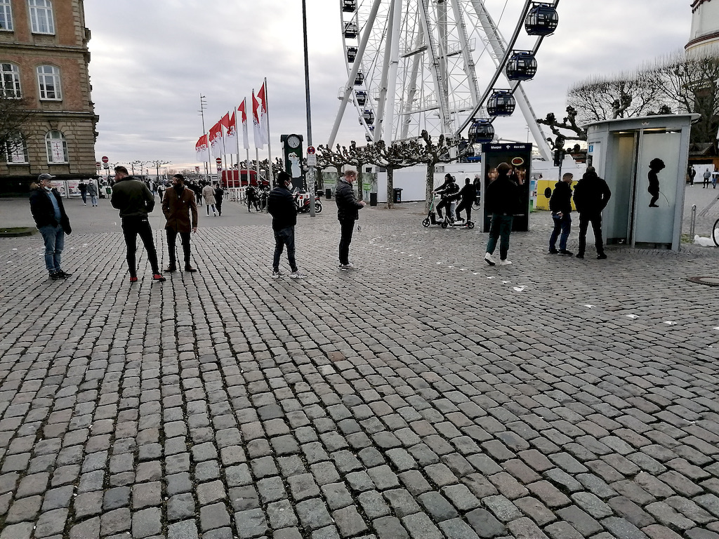 Tja, Not macht nicht nur erfinderisch. Auch hartnäckig — wie man deutlich an diesen langen Schlangen sieht. Sie bilden sich häufig vor den wenigen City-Toiletten (hier am Burgplatz), die in Zeiten der Pandemie den Menschen zur Verfügung stehen.