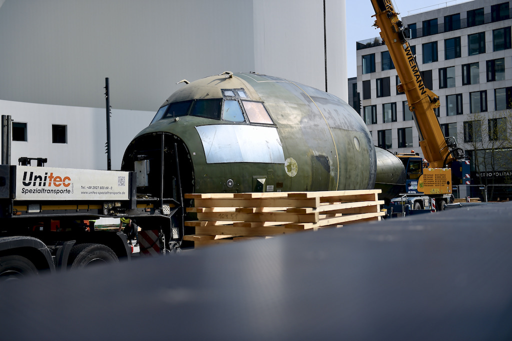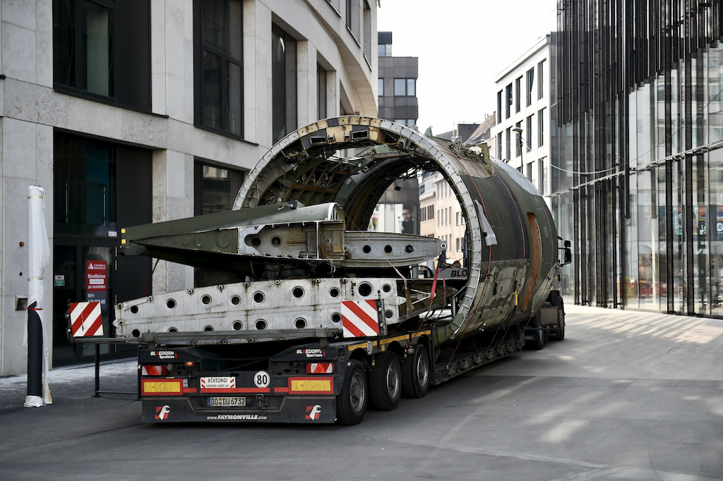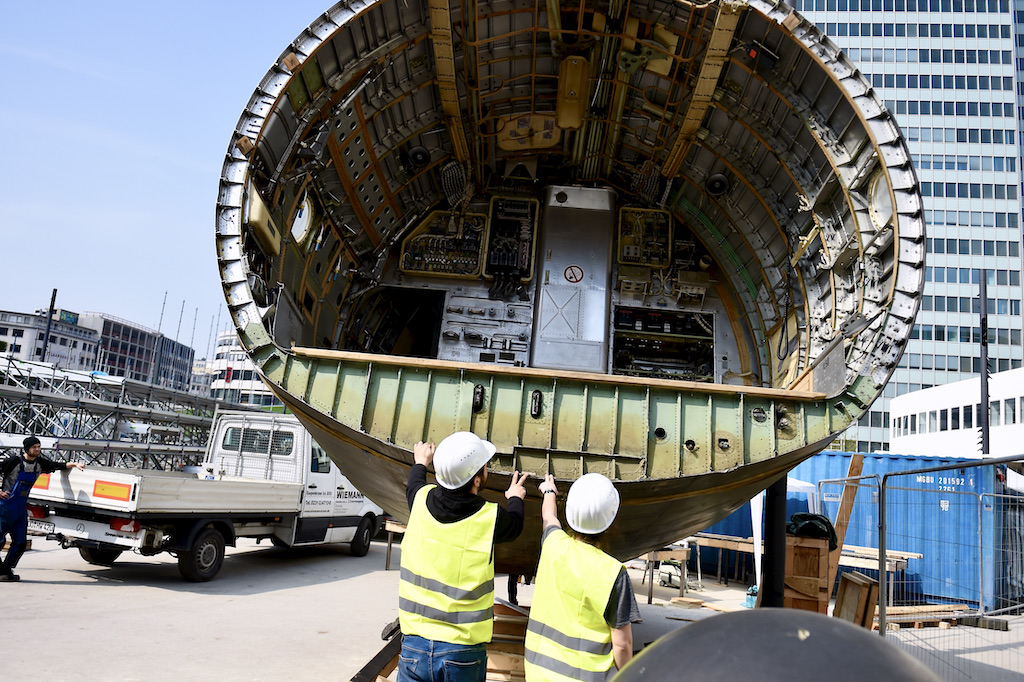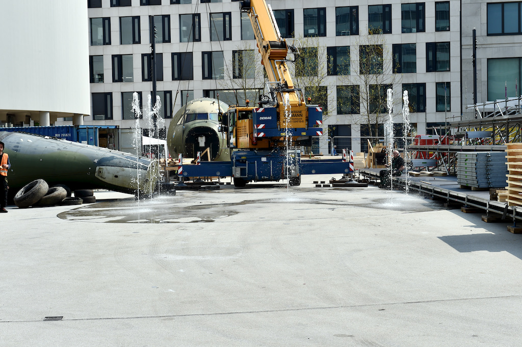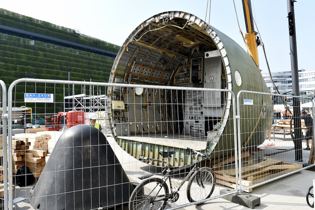 Die Flugzeugteile, darunter ein Heck in Originalgröße, hat sich das Künstlerkollektiv über das Internet bei der Bundeswehr in München besorgt. „40 Jahre lang hat die Transall der Bundeswehr gedient, jetzt wird sie auseinander gesägt und verschrottet“, sagt Benjamin Foerster-Baldenius. „Für mich ist der Flieger der Trabant der Lüfte, vermutlich konnte man ihn mit Schraubenzieher und Hammer reparieren. Das hat eine menschliche Dimension.“ Foerster-Baldenius ist einer von neun Architekten, die hinter Raumlabor stehen und deren zentraler Arbeitsbereich die Kunst ist. „In unseren Augen ist ein Raum nicht allein eine umbaute Zone. Ein Raum entsteht durch soziale Interaktion.“