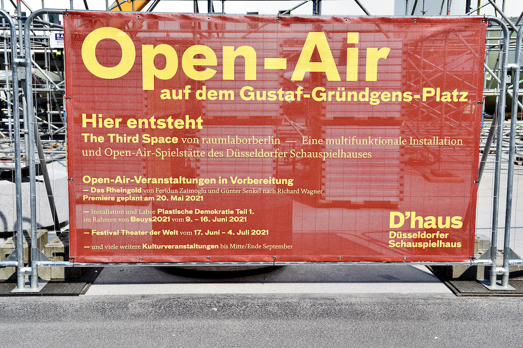 Das Düsseldorfer Schauspielhaus plant 2021 gemeinsam mit einigen Partnern einen Open-Air-Sommer auf dem Gustaf-Gründgens-Platz. In der Zeit von Mai (vorausgesetzt die Pandemiebedingungen machen es möglich) bis September 2021 entwickelt das Düsseldorfer Schauspielhaus mit der Berliner Künstlergruppe raumlaborberlin »Third Space« – eine multifunktionale Installation, die sich im Laufe des mehrteiligen Projektzeitraums immer wieder verändert. Eine modulare Besuchertribüne ist Teil der Installation und bietet dem Düsseldorfer Schauspielhaus eine Spielstätte für bis zu 400 Personen, die unter Corona-Bedingungen für bis zu 200 Personen nutzbar ist.