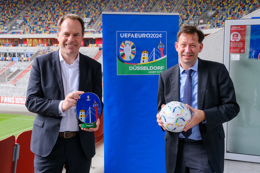 Nach der Prä­sen­ta­tion des Logos für die EURO 2024 stell­ten Ober­bür­ger­meis­ter Dr. Ste­phan Kel­ler und Stadt­di­rek­tor Burk­hard Hintzsche am Mitt­woch das lokale “UEFA EURO 2024 Düsseldorf”-Logo in der Aus­tra­gungs­stätte, der Arena, vor,©Landeshauptstadt Düsseldorf/Michael Gsttenbauer