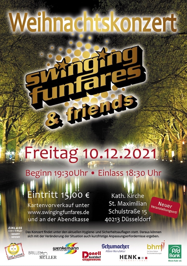 Eintrittskarten (je 15,- €) sind an der Abendkasse, oder vorab per Internetbestellung, über www.swingingfunfares.de erhältlich. Einlass nach 2G-Regel (vollständig geimpft oder genesen)