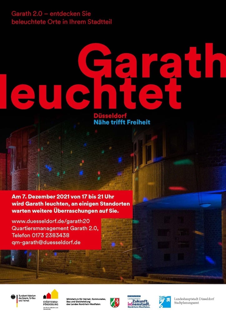 Gemeinsam mit zahlreichen Einrichtungen startet das Quartiersmanagement Garath 2.0 die Aktion “Garath leuchtet 2021”. Garather Vereine, Institutionen, Einrichtungen und Gewerbetreibende werden ihre Gebäude, Geschäfte oder auch das Umfeld an diesem Abend besonders beleuchten. Die Aktion kann auch unter Coronabedingungen durchgeführt werden. Alle Standorte sind bei einem Spaziergang von draußen sichtbar, und Abstände können eingehalten werden.