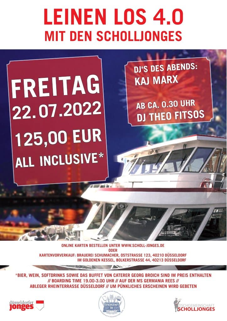 Michael Brühl, Tischbaas der Scholljonges ist sich sicher, mit der MS Germania Rees ein Schiff gefunden zu haben, welches den Ansprüchen entspricht.Die Besatzung der MS Germania Ress und die Scholljonges werden dafür sorgen, daß sich alle Gäste an Bord wohl fühlen. Für das leibliche Wohl ist gesorgt. Neben anderen Getränken gibt es Schumacher Alt vom Fass.