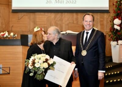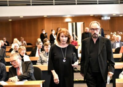 Die Verleihung wurde musikalisch vom “Virtus Quartett”, Streichquartett der Robert Schumann Hochschule, begleitet. Sie spielten das Menuett aus Mozarts KV 387 aus dem Film “Die weiße Rose” sowie Antonín Dvořáks Miniatur Nr. 1. Zudem gab ein Filmbeitrag des Filmmuseums Einblicke in die Arbeiten des Regisseurs Michael Verhoeven. Höhepunkt des Festaktes war die Verleihung des Helmut-Käutner-Preises durch Oberbürgermeister Dr. Stephan Keller. Im Anschluss trug sich Michael Verhoeven zudem in das Goldene Buch der Landeshauptstadt Düsseldorf ein.