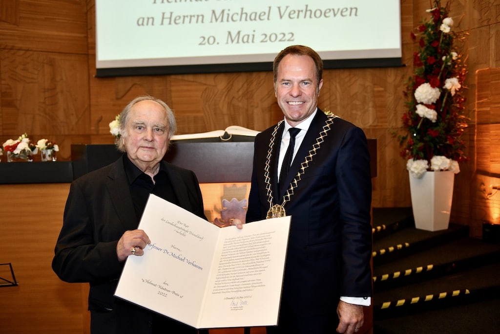 Oberbürgermeister Dr. Stephan Keller: “Sehr geehrter Herr Verhoeven, mit dem Käutner-Preis wird heute Ihr filmisches Lebenswerk gewürdigt. Zugleich wertschätzen wir Ihr gesellschaftliches Engagement und Ihren kritischen Blick, den Sie als politischer Regisseur auf die deutsche Geschichte gerichtet haben. Seit rund fünf Jahrzehnten setzen Sie sich in Ihren Spiel- und Dokumentarfilmen auf ebenso einzigartige wie kritische Weise sowohl mit der Historie als auch mit gesellschaftlichen Entwicklungen auseinander.”
