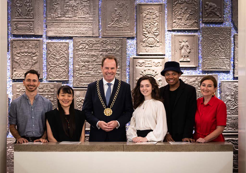 Die Preisträger des Förderpreises für Kunst und Wissenschaft der Landeshauptstadt Düsseldorf 2020: Alfredo Zinloa, Chikako Kaido, Pearl Seemann und Nicholas Grafia (v.l.) zusammmen mit OB Dr. Stephan Keller (M.) und der Beigeordneten Miriam Koch (l.).,©Landeshauptstadt Düsseldorf/Lars Heidrich