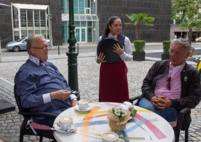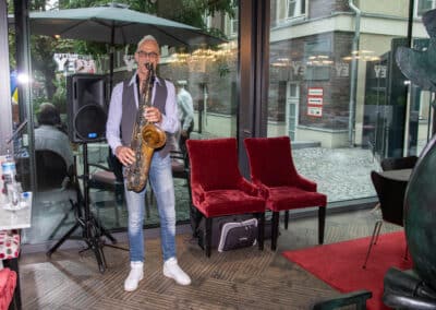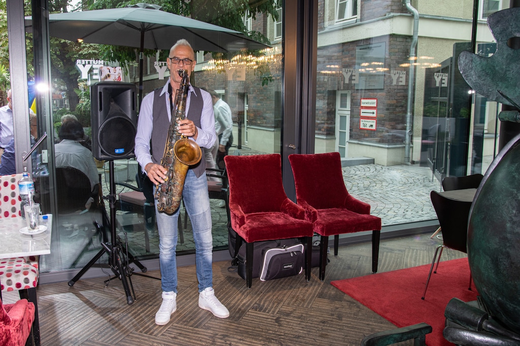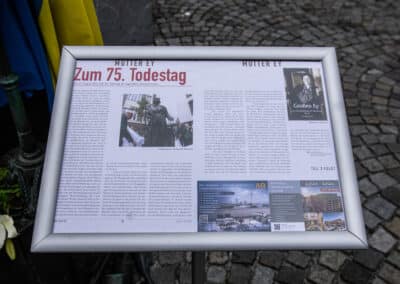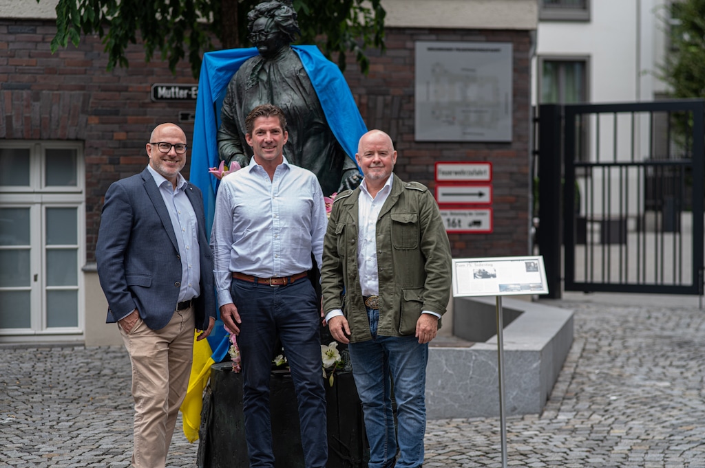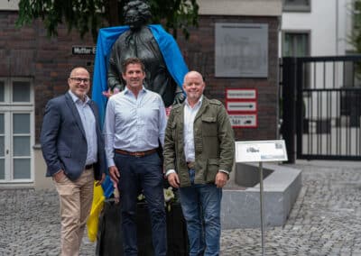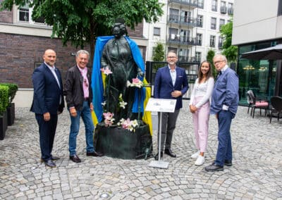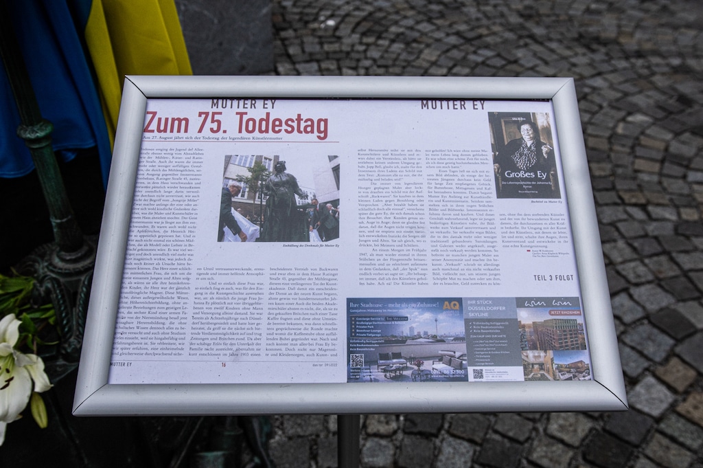 Die große bronzene Statur von Mutter Ey, gestaltet vom Düsseldorfer Künstler Bert Gerresheim war vor dem Mutter Ey Kunst-Kaffee mit Blumen an diesem Tage geschmückt, ja sie trug auch symbolisch als Umhang die Fahne der Ukraine. Symbol für Frieden in mitten des Krieges in der Ukraine in unseren Tagen. Uwe Schmitz, Vorstandsvorsitzender der Frankonia Eurobau und Chef des Andreas Quartier hat neben vielen sozialen Unterstützungen nicht nur davon geredet, sondern tatkräftig auch Menschen direkt geholfen, so u.a. mehr als 10 Familien in seinem Unternehmen eine Unterkunft zur Verfügung gestellt.