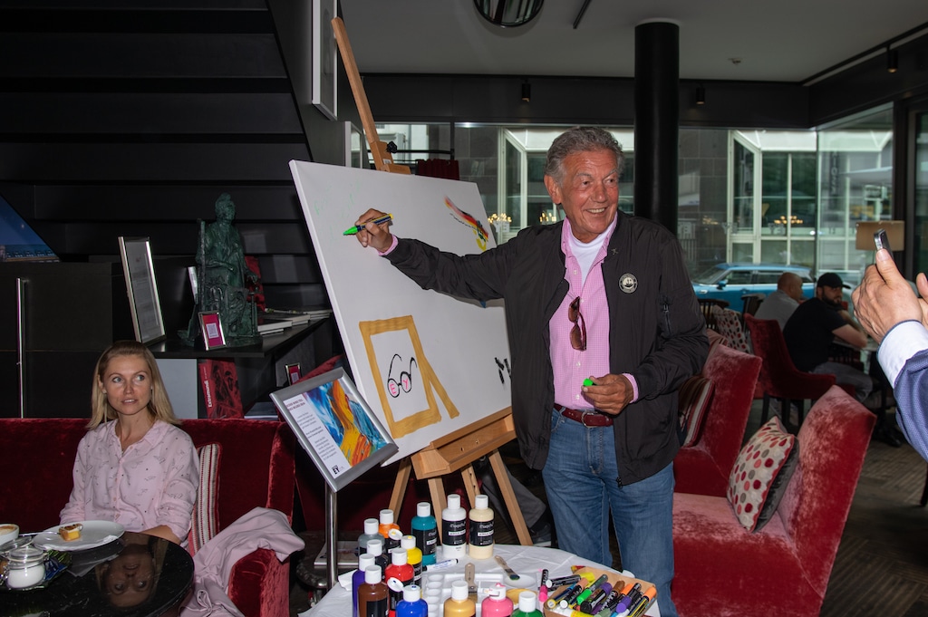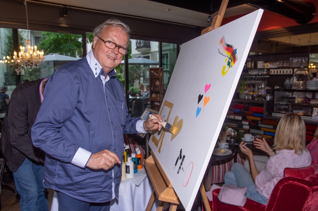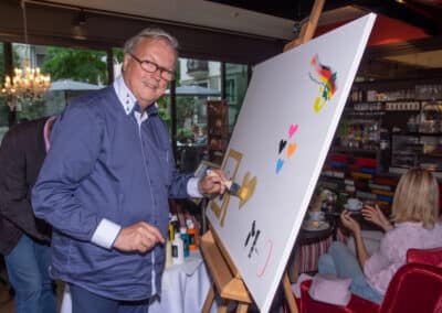 Zum Todestag von Mutter Ey trafen sich dann einige prominente Düsseldorfer und haben gemeinsam mit der Geschäftsleitung von Frankonia Eurobau Stephan Bruns und Marcel Hommes die Gedenkaktion eröffnet. Es galt bei Kaffee und Kuchen natürlich auch die Kunst in den Vordergrund zu setzen, und hier waren nicht Profis an diesem Tage gemeint, sondern die Gäste des Mutter Ey Kunst-Kaffee konnten sich auf einer gemeinsamen Leinwand mit einem eigenen Kunstwerk verewigen, was dann ein gemeinsames Gesamtkunstwerk entstehen ließ.