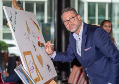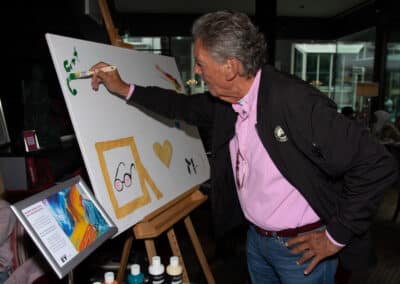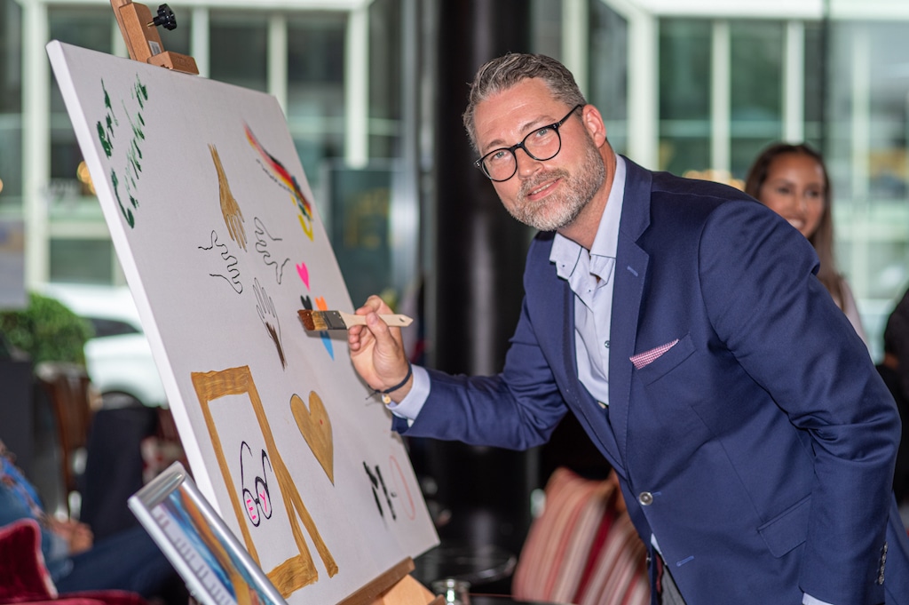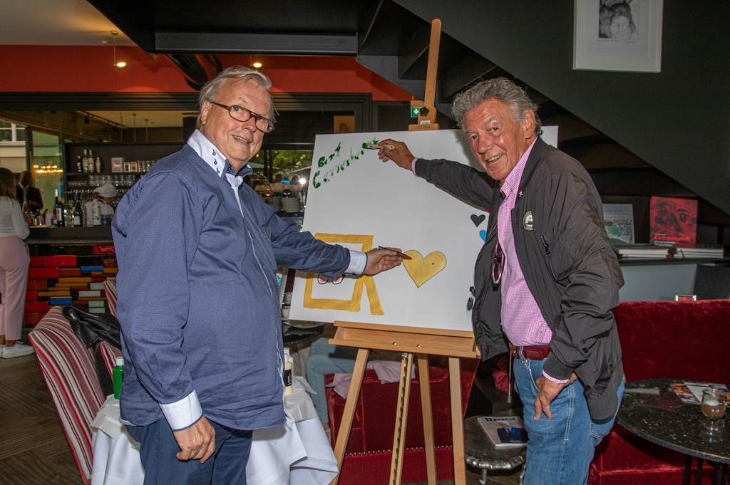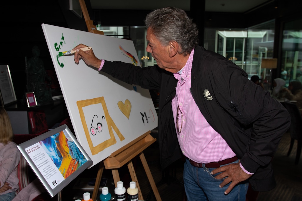 So malten u.a Jonges Baas Wolfgang Rolshoven mit den Vorsitzenden Marcel Kreuter der Tischgemeinschaft „MUTTER EY“ der Düsseldorfer Jonges den Namenszug des Künstlers der Mutter Ey Statur Bert Gerresheim. Frankonia Geschäftsführer Stephan Bruns gestaltete vier Hände aus vier Nationen im „Miteinander und Füreinander“. Heribert Klein, Mitglied des Deutschen Komitee für UNICEF setzte Zeichen mit seinem UNICEF-HERZ für Kinder in Not.