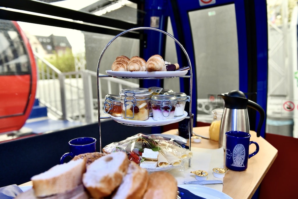 Selbstverständlich gibt es ausreichend Kaffee und Orangensaft, denn die Frühstücksfahrt in der beheizten Gondel im Riesenrad dauert im Gegensatz zur normalen Fahrt (knapp eine Viertelstunde) eine volle Stunde.