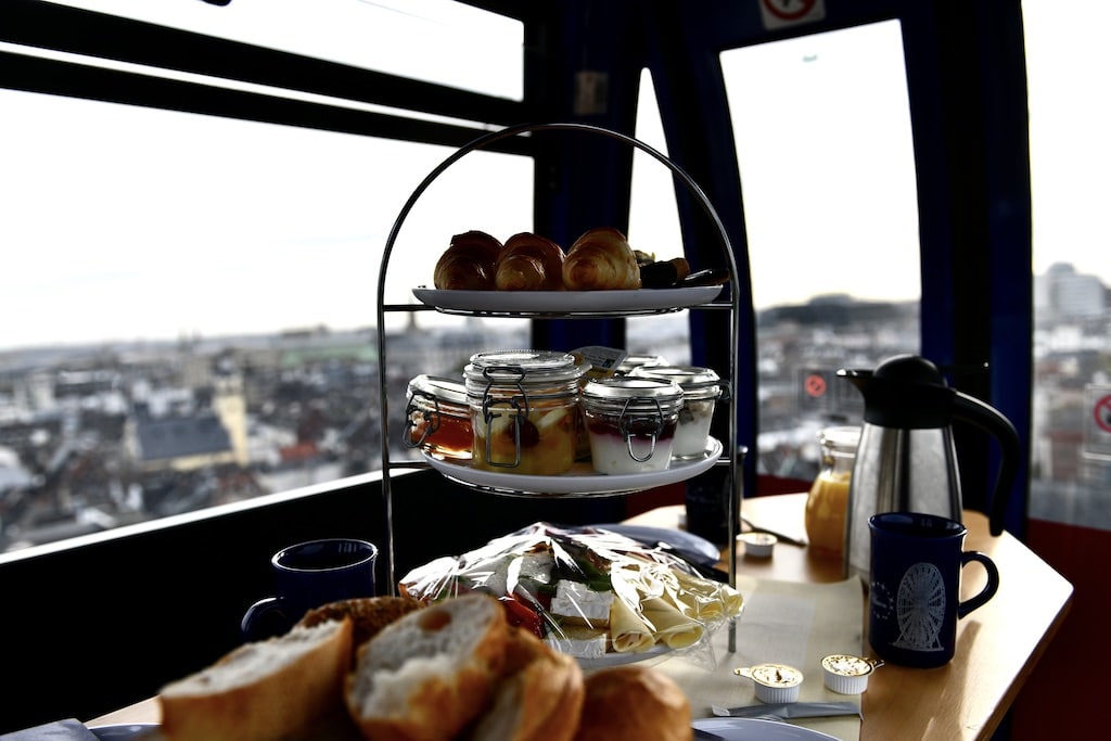 Oscar Bruch jr und sein Team bieten ein exklusives Frühstück an, das bis zu vier Personen in einer Gondel genießen können. Zuvor gibt es für jeden Gast am Riesenrad ein Glas Prosecco. Dann geht es zum liebevoll gedeckten Tisch – mit Geschirr, Tassen und einer Etagere, die opulent bestückt ist. Vom Croissant, übers knusprige Brötchen und Brot bis hin zu Marmeladen, Käse und Wurst sowie Müsli und Obstsalat hat Elisabeth Pal alles vorbereitet – auch das köstliche Rührei, das in einer Spezialdose warm bleibt.