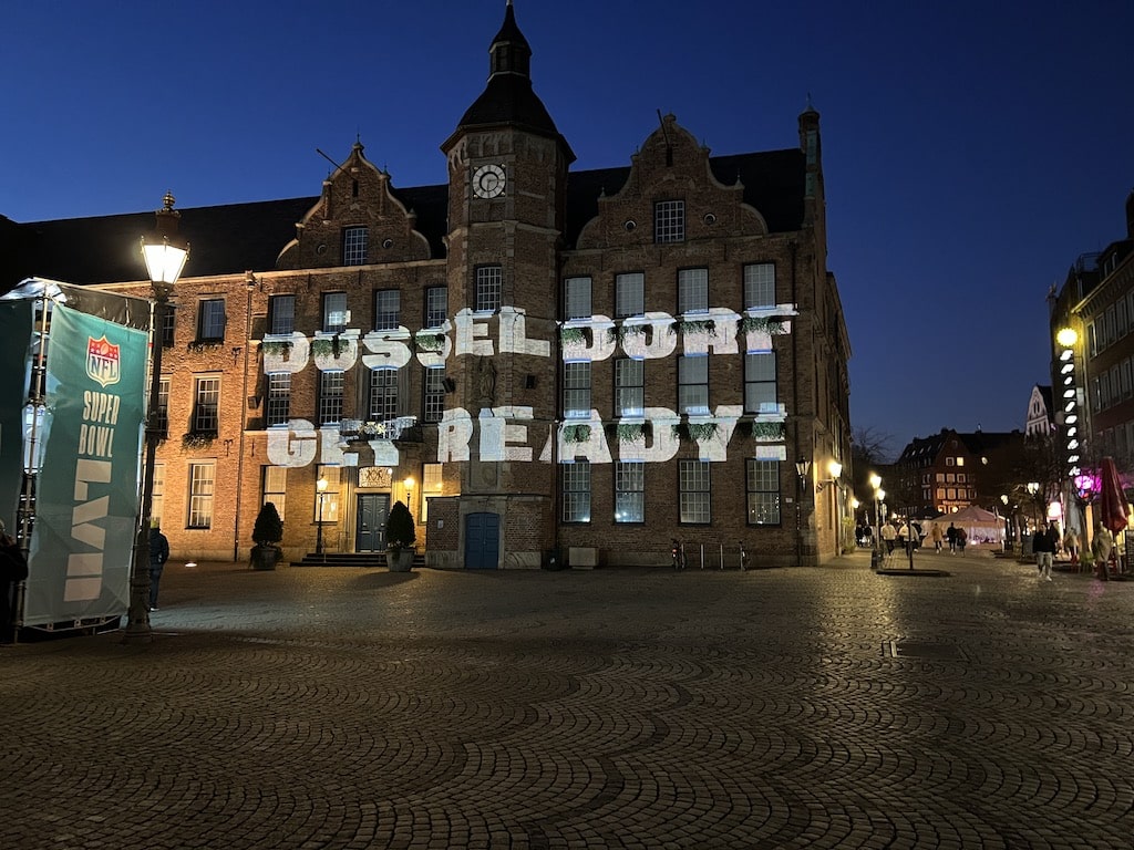 Es soll das Rat­haus unter ande­rem mit dem Logo der NFL sowie mit dem Spruch „Düs­sel­dorf Get ready for Action all night“ ange­leuch­tet werden.