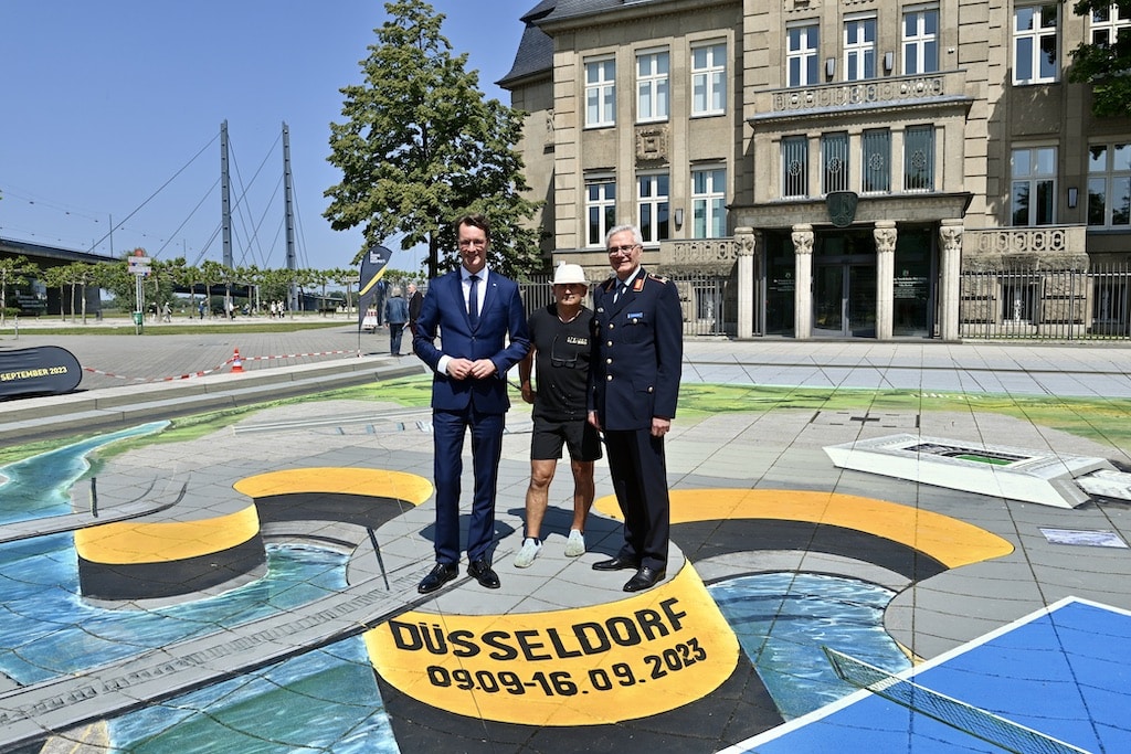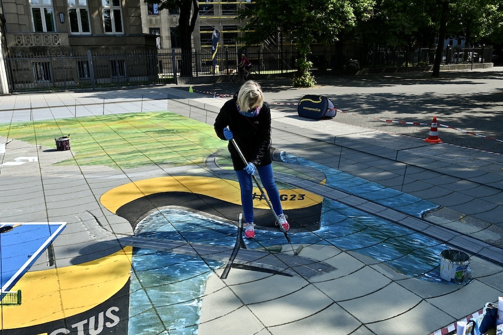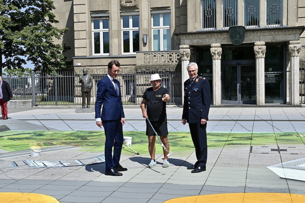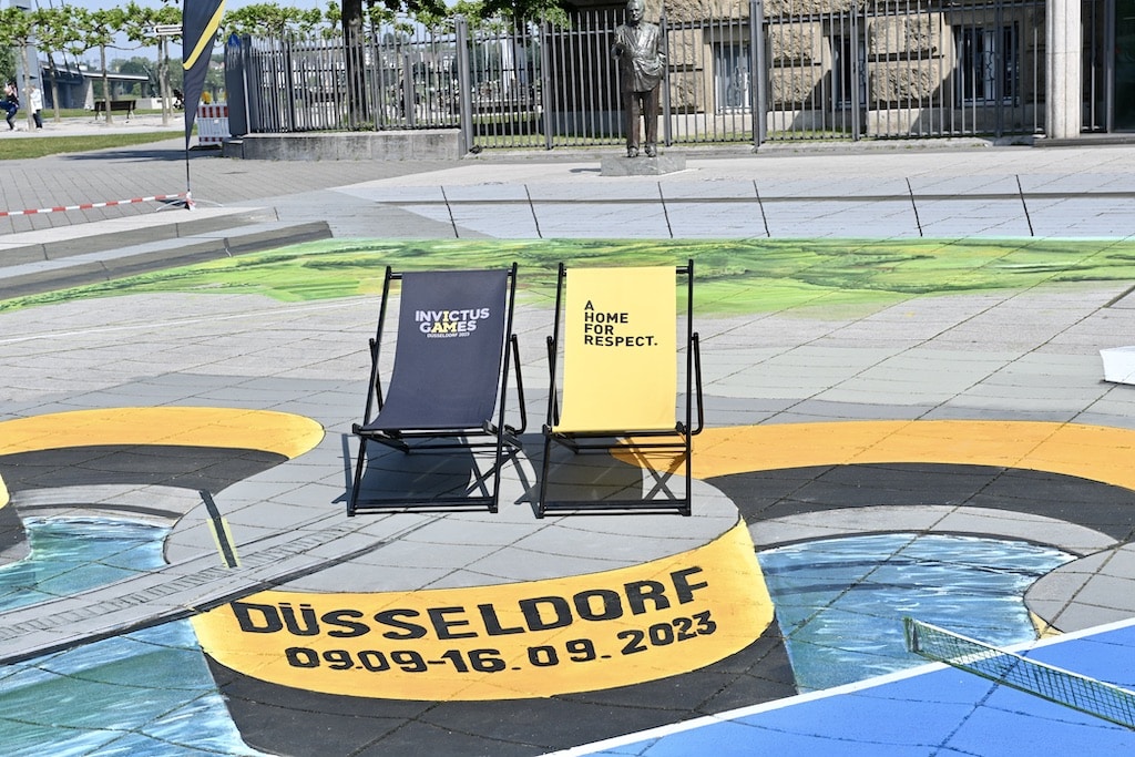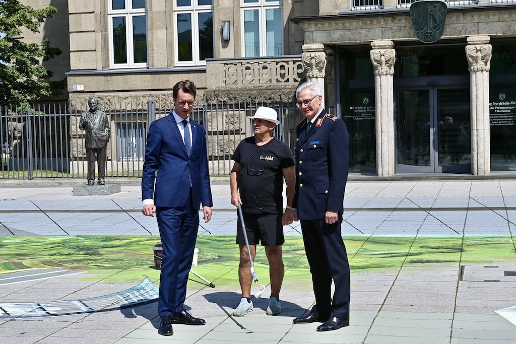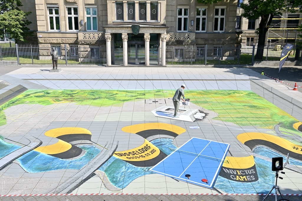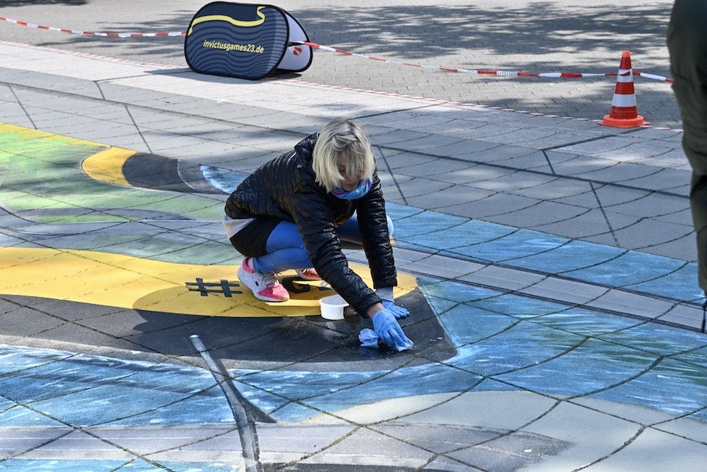 Die INVICTUS GAMES sind in erster Linie eine Sportveranstaltung. Darüber hinaus geht es darum, einen Austausch zwischen der Gesellschaft und ihren Soldaten und Soldatinnen zu initiieren, und das geschieht unter anderem durch Kunst und Kultur. In diesem Sinne hat der Künstler Gregor Wosik vom 22. Mai 2023 bis 26. Mai 2023 sein Kunstwerk zum Thema INVICTUS GAMES auf dem Johannes-Rau-Platz, 40213 Düsseldorf, gemalt. Heute wurde das Kunstwerk fertiggestellt. Projektleiter des Projektteams INVICTUS GAMES Düsseldorf 2023, Brigadegeneral Alfred Marstaller schaute vorbei um sich selber ein Bild von dem Kunstwerk zu machen. Auf dem Weg vom Landtag zur Staatskanzlei nahm Ministerpräsident Hendrik Wüst sich die Zeit für ein Gespräch mit dem Künstler und dem Brigadegeneral. Unterstützt bei der Erstellung des Werkes wurde der Künster von seiner Partnerin Daniela Löh.