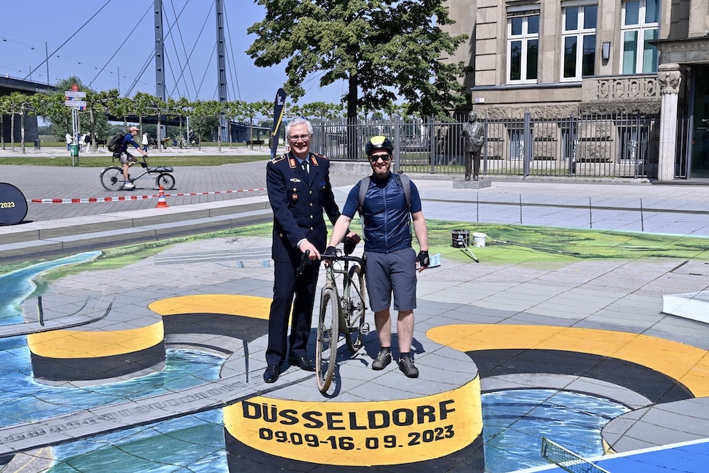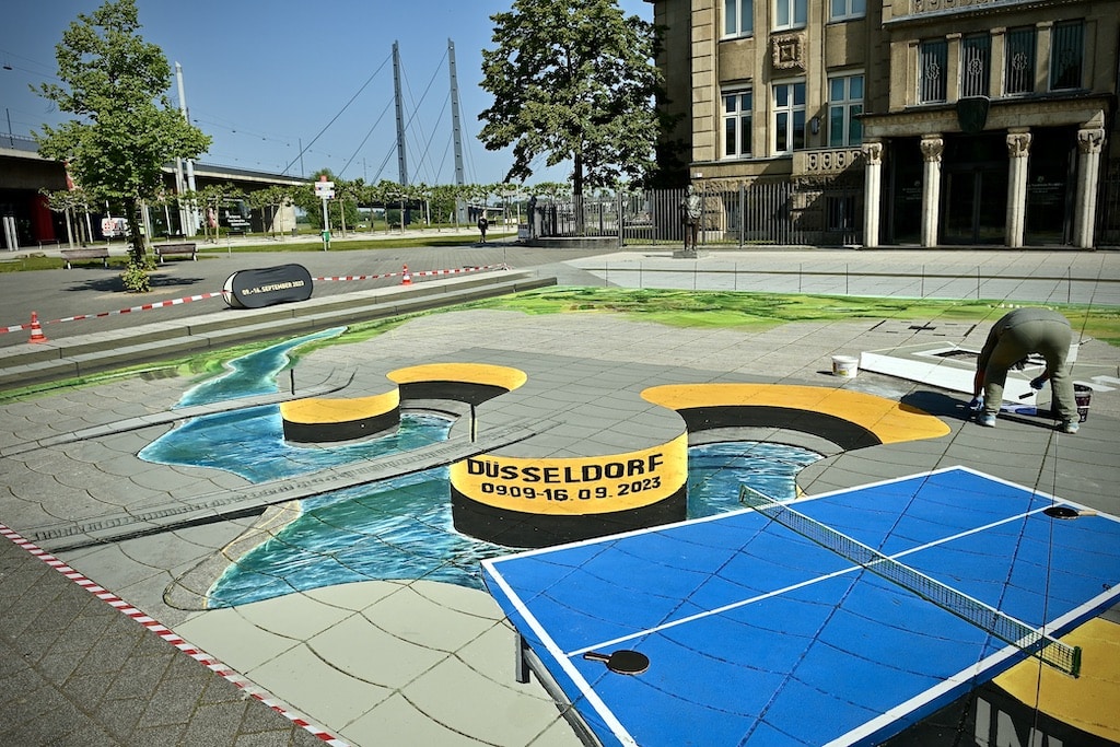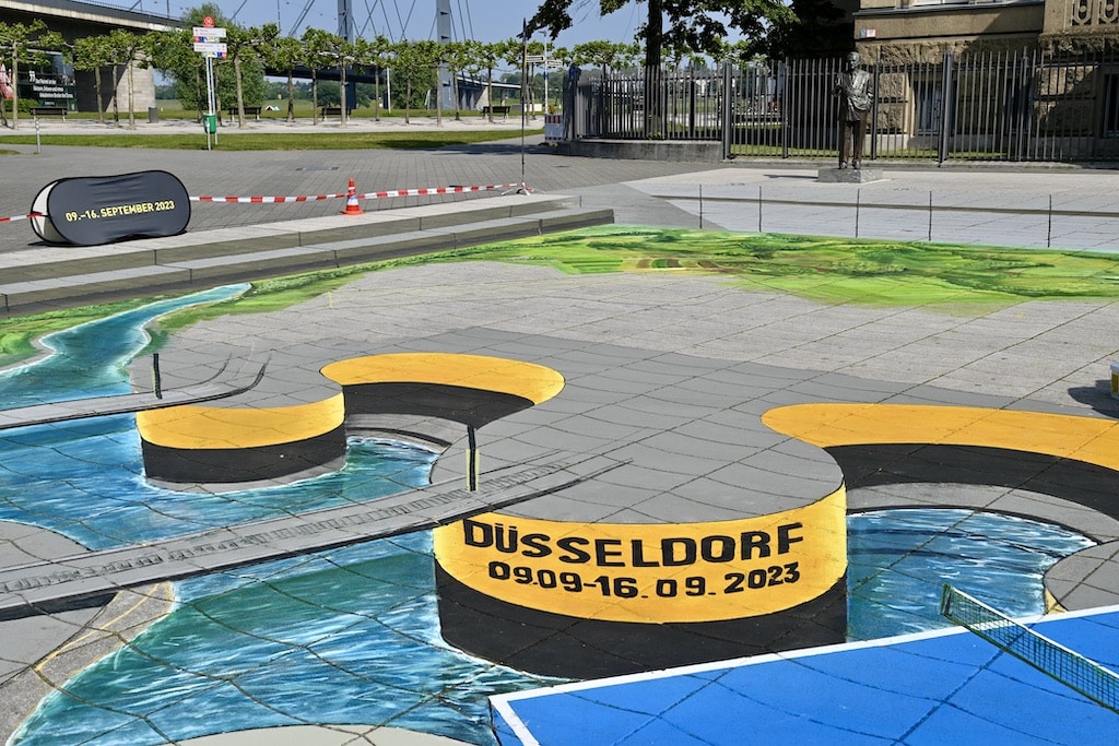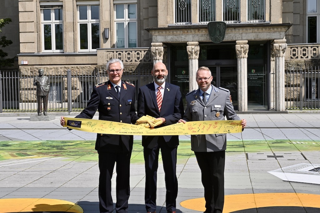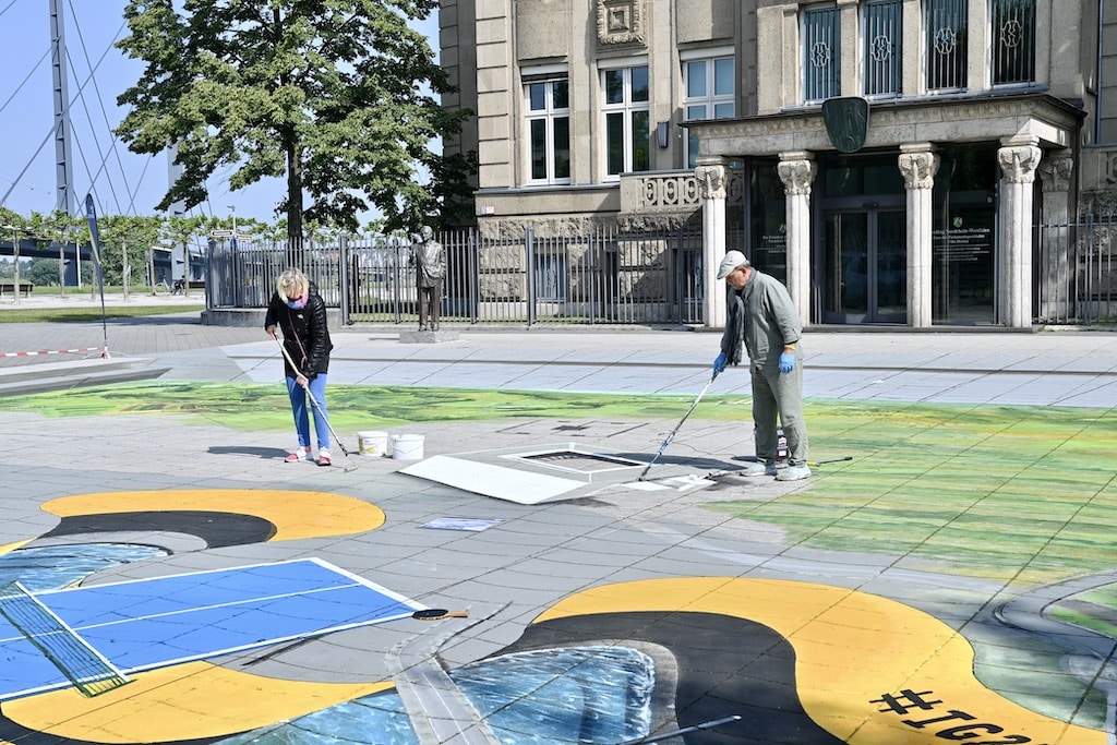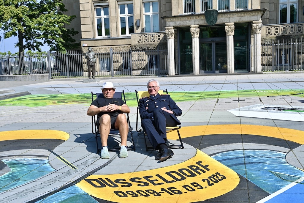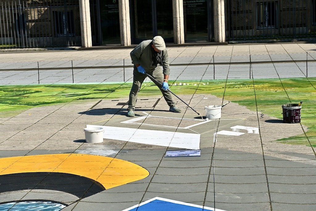 Die INVICTUS GAMES sind in erster Linie eine Sportveranstaltung. Darüber hinaus geht es darum, einen Austausch zwischen der Gesellschaft und ihren Soldaten und Soldatinnen zu initiieren, und das geschieht unter anderem durch Kunst und Kultur. In diesem Sinne hat der Künstler Gregor Wosik vom 22. Mai 2023 bis 26. Mai 2023 sein Kunstwerk zum Thema INVICTUS GAMES auf dem Johannes-Rau-Platz, 40213 Düsseldorf, gemalt. Heute wurde das Kunstwerk fertiggestellt. Projektleiter des Projektteams INVICTUS GAMES Düsseldorf 2023, Brigadegeneral Alfred Marstaller schaute vorbei um sich selber ein Bild von dem Kunstwerk zu machen. Auf dem Weg vom Landtag zur Staatskanzlei nahm Ministerpräsident Hendrik Wüst sich die Zeit für ein Gespräch mit dem Künstler und dem Brigadegeneral. Unterstützt bei der Erstellung des Werkes wurde der Künster von seiner Partnerin Daniela Löh.