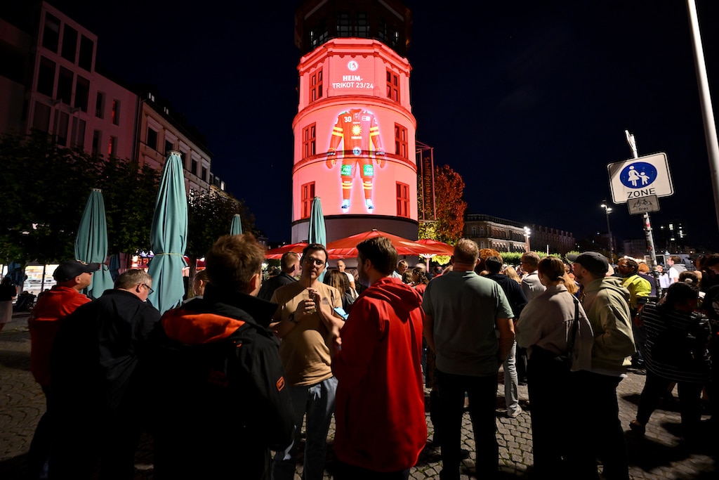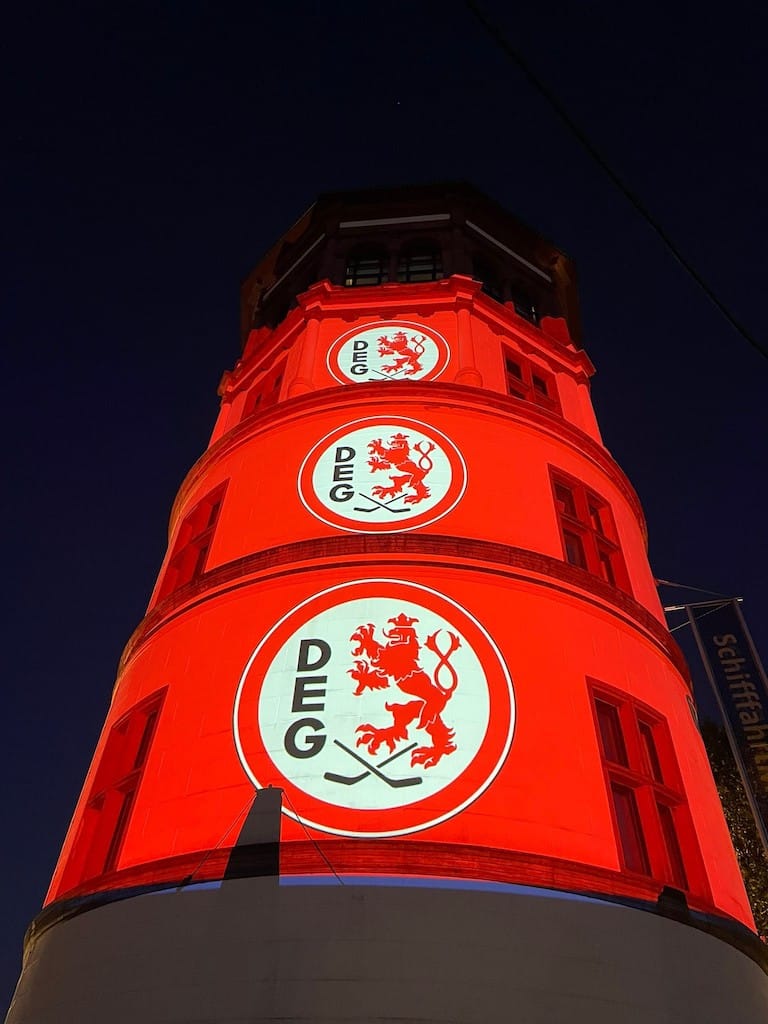 „Wo der alte Schlossturm steht, da sind wir zuhaus!“ Es war eine Präsentation der besonderen Art: Die Düsseldorfer EG hat ihre neuen Spieltrikots der Saison 2023/24 vorgestellt – und das per Beamer-Projektion auf der Fassade des Düsseldorfer Schlossturms.