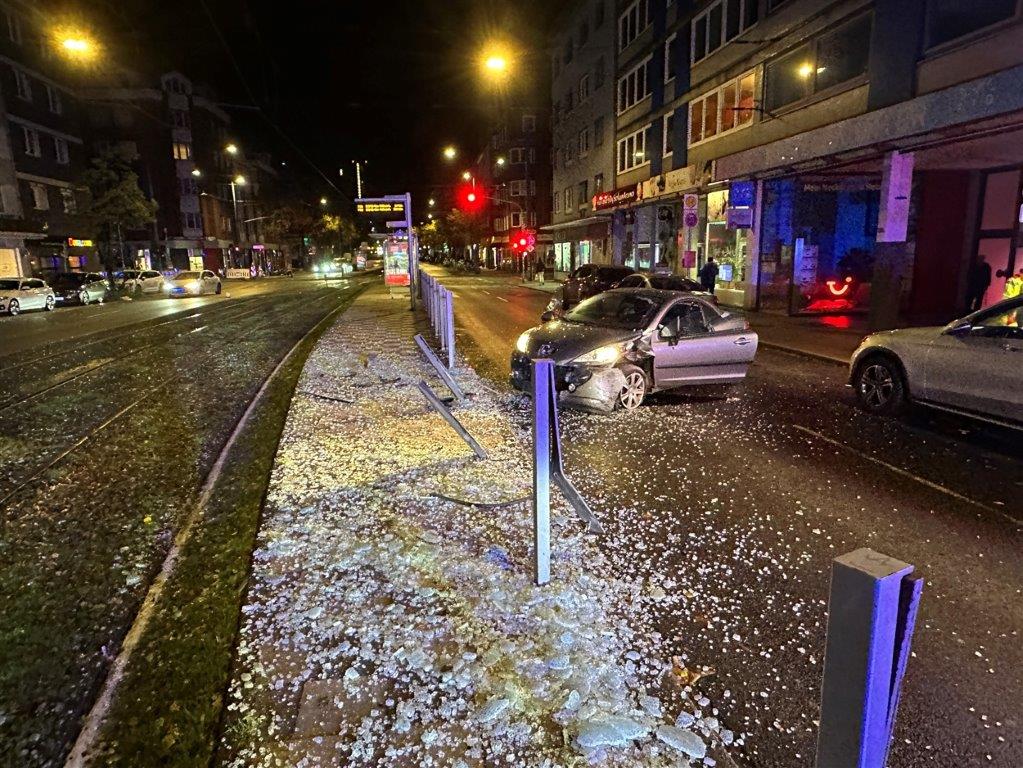 Kurz vor 23:30 Uhr fiel einer Streifenbesatzung der Kleinwagen auf, als dieser in die Münsterstraße in Fahrtrichtung Toulouser Allee einbog und Schlangenlinien fuhr. Die Fahrerin geriet dabei auch auf das mittig verlaufenden Gleisbett der Straßenbahn. Die Fahrerin zog den Pkw wieder auf die Fahrbahn, daraufhin aber wieder zurück auf die Schienen und steuerte anschließend ihr Fahrzeug in den Bahnsteig einer Rheinbahnhaltestelle. Hierbei kollidierte der Peugeot mit den verglasten Haltestellenbegrenzungen, wobei vier Scheiben zerbrachen. Das Auto kam letztlich auf der Fahrbahn zum Stehen. Zum Glück befanden sich zu dieser Zeit keine Passanten in der Nähe der Haltestelle. Die 56-Jährige erlitt nur leichte Verletzungen.