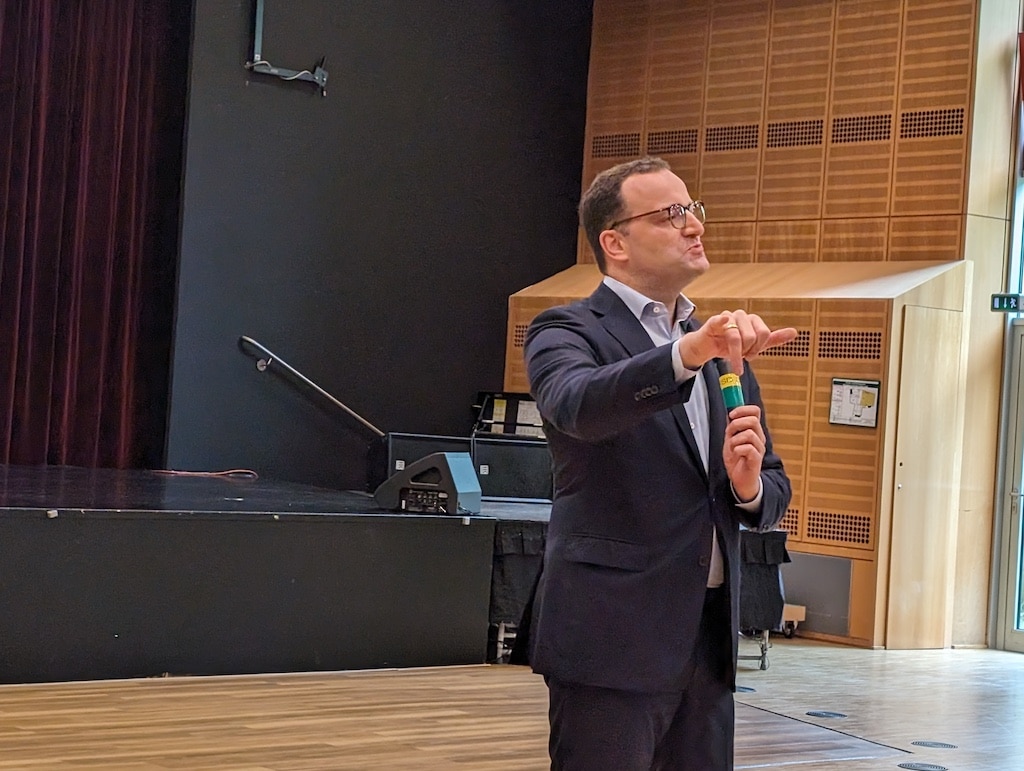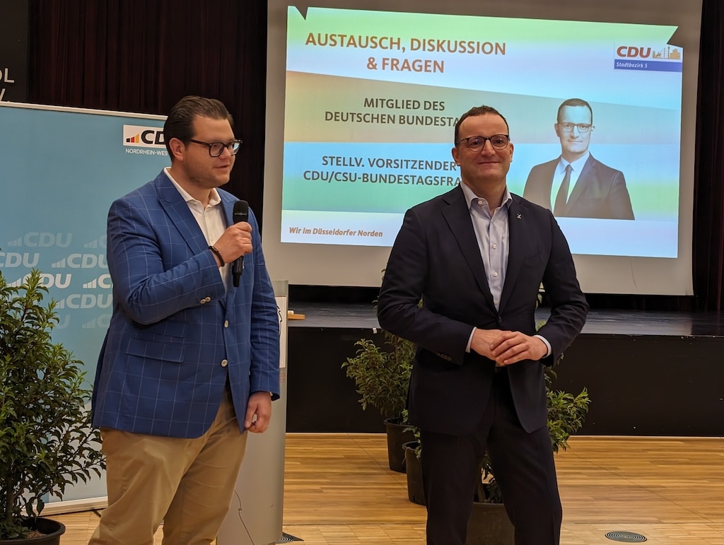 Etwa um 11.10 Uhr legte Jens Spahn, MdB der CDU und ehe­ma­li­ger Gesund­heits­mi­nis­ter, am 27. April im Hör­saal vor 400 Gäs­ten los, gut gelaunt, rhe­to­risch extrem geschickt, ohne Leer­zei­len, ohne Sto­cken und sprach genau das aus, was viele dach­ten: Wir haben die schlech­teste Bun­des­re­gie­rung ever. Dass Jens Spahn, der in Ahaus in Nie­der­sa­chen auf­wuchs, der Ein­la­dung der CDU im Nor­den so gern gefolgt ist, hat zwei Gründe. Mit Tho­mas Jar­zom­bek, MdB und Düs­sel­dor­fer CDU-Chef, ver­bin­det ihn eine lang­jäh­rige Sitz­nach­bar­schaft im Bun­des­tag. Und sicher auch eine Freund­schaft. Dass er im Alter von 14 Jah­ren erst­ma­lig die Düs­sel­dor­fer Alt­stadt besucht und anschlie­ßend gleich in die Junge Union ein­ge­tre­ten ist, gab Domi­nik Dim­mend­aal bei der Begrü­ßung des Ehren­gas­tes zum Bes­ten. Über­haupt hatte der Pres­se­spre­cher der CDU-Frak­tion im Nor­den gut recher­chiert. Etwa, dass Jens Spahn (43) gerne 105 Jahre alt wer­den möchte.