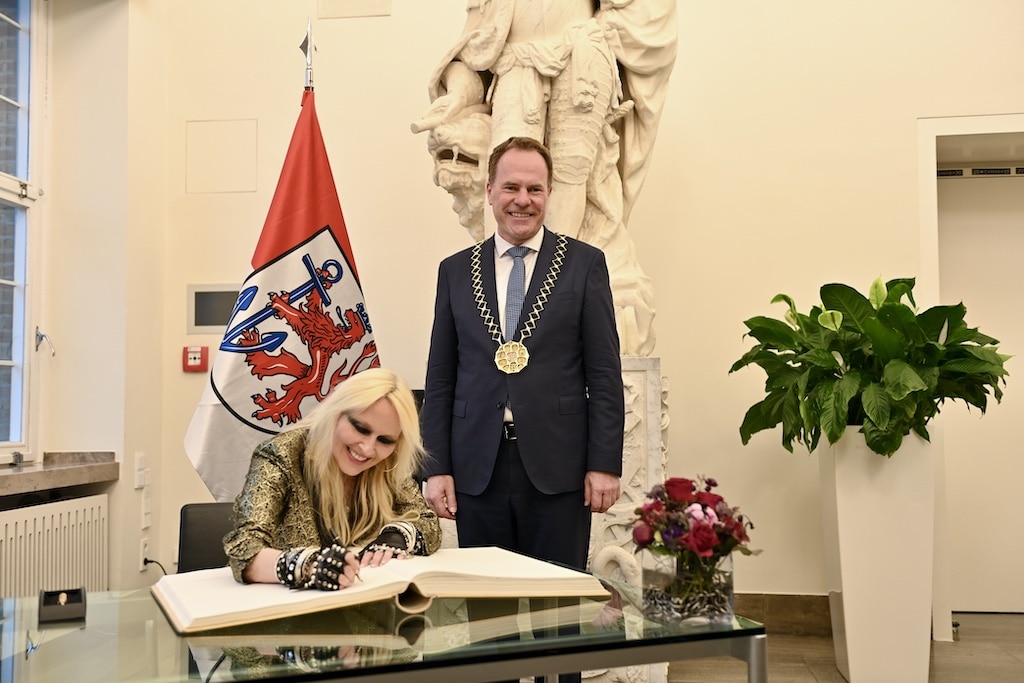 Die Düsseldorfer Rockmusikerin Doro Pesch trug sich ins Goldene Buch der Stadt ein. Die ungekrönte Queen of Metal zeigte sich überglücklich. „Es bedeutet mir unendlich viel“, schrieb die Sängerin, nachdem Oberbürgermeister Stephan Keller sie in den höchsten Tönen gelobt hatte.