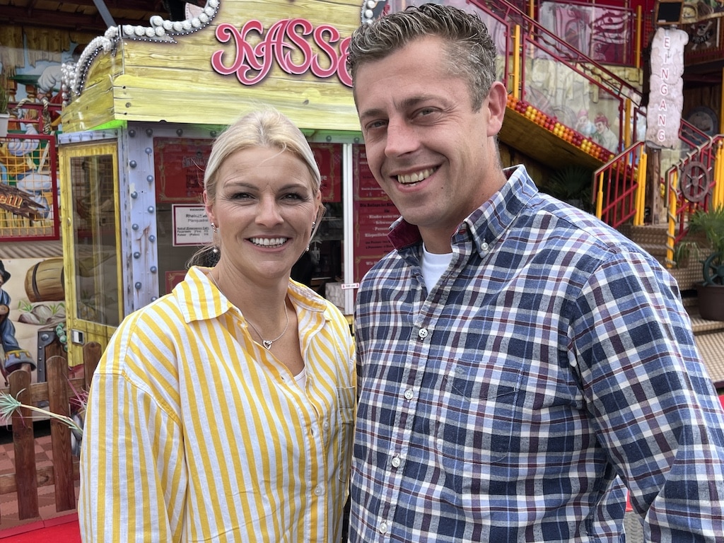 Die Düsseldorfer Schausteller Jennifer Dreßen und Marcel Schmelter freuen sich, erstmals mit ihrem Geschäft auf der Rheinkirmes zu sein Foto: LB / Manfred Fammler