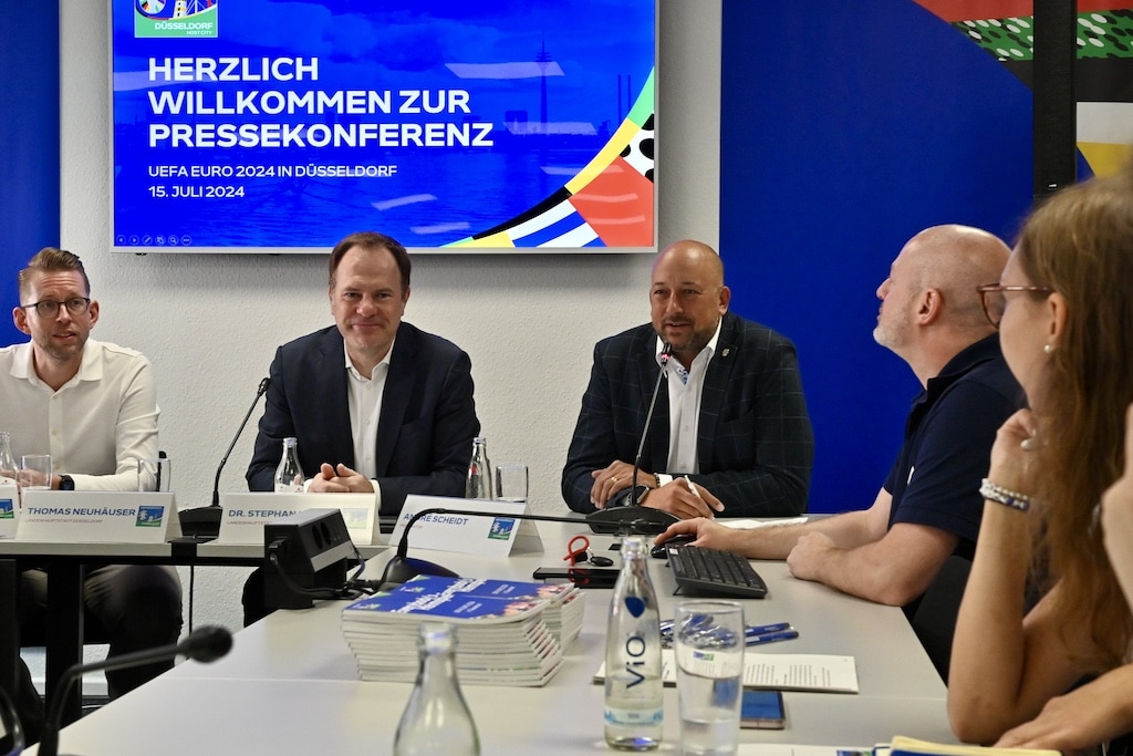 Pressekonferenz zum Abschluß der EURO 2024 v.l. Thomas Neuhäuser (Projektleitung), OB Dr. Stephan Keller und Andre Scheidt (Stadionsprecher)