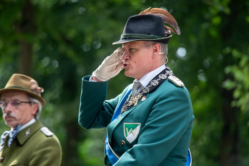 Der Höhepunkt des Umzugs war die große Parade an der Jägerhofallee, die Oberst Torsten Peters erstmals anführte. Auf seinem Pferd “General” ritt er stolz an der Tribüne vor und meldete die Bereitschaft für die Parade. Düsseldorfs größter Schützenverein, der 1600 Mitglieder und 29 Gesellschaften umfasst, war in voller Stärke vertreten.