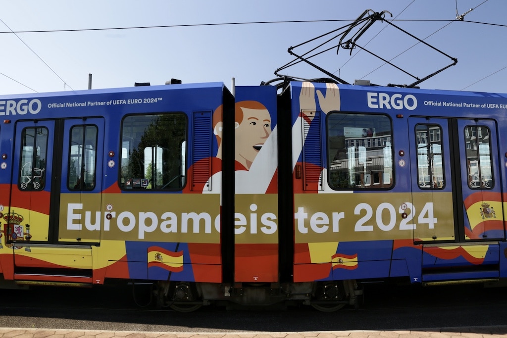 24 Züge der Rheinbahn hießen die Teilnehmerländer der UEFA EURO 2024 in Düsseldorf in der jeweiligen Landessprache willkommen. Mit einer Sonderfolierung gratulieren die Landeshauptstadt Düsseldorf und das Versicherungsunternehmen ERGO jetzt den Siegern des Turniers, dem neuen Europameister Spanien. Noch bis Jahresende können sich Düsseldorferinnen und Düsseldorfer und die zahlreichen Gäste der Landeshauptstadt an der Europameister-Spanien-Bahn erfreuen.