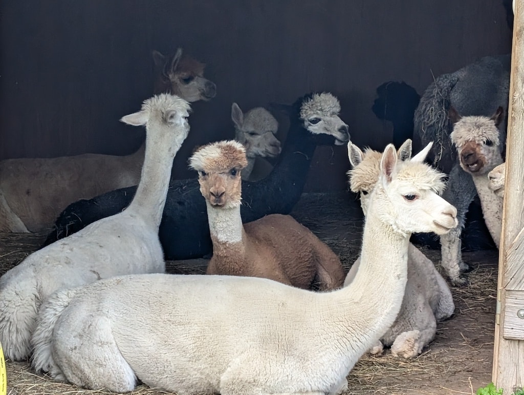 Sie haben ein herr­li­ches Leben auf der Weide. Sie kön­nen ent­schei­den, wann sie in ihre große, kusche­lige Scheune gehen, wann sie fres­sen, wann sie trin­ken. Die Alpa­kas zäh­len zu den Wie­der­käu­ern, was bedeu­tet, dass sie nur unten Schnei­de­zähne haben und oben eine Kau­platte. So hängt das Stroh in Kopf­höhe, was es den Tie­ren ein­fach macht, an ihre Nah­rung zu gelangen.