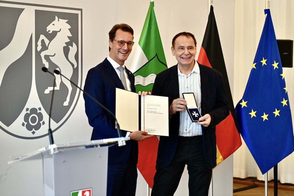 Ministerpräsident Hendrik Wüst sagte in seiner Rede über Jacques Tilly aus Düsseldorf: „Jacques Tilly ist vor allem bekannt für seine politischen und gesellschaftskritischen Werke. Seit gut 30 Jahren entwirft und baut er äußerst phantasievoll politisch-satirische Mottowagen für den Düsseldorfer Rosenmontagszug. Nicht umsonst wird seine Werkstatt liebevoll-spöttisch auch ‚Skandal-Schmiede‘ genannt. Die Düsseldorfer Karnevalsverbände gewähren ihm buchstäblich Narrenfreiheit. Und die weiß er zu nutzen. Pointiert und voller Spottlust stellt er mit stark überzeichneten, aber stets humorvoll wirkenden Großplastiken Missstände in Politik und Gesellschaft dar. Meinungsstark und mutig. Er scheut keine Institution, Staatsmacht oder Autorität. Wo es Missstände gibt, deckt Jacques Tilly sie kritisch und mit beißender Satire auf. Die Kunstwerke von Jacques Tilly und seinem Team regen zum Nachdenken an und sorgen oft für kontroverse Diskussionen. Seine Bildsprache ist global verständlich und von hoher künstlerischer Qualität. Seine Mottowagen werden von den Medien aus aller Welt aufgegriffen, und die Bilder zieren in den Tagen nach Karneval Titelseiten der deutschen und auch der internationalen Presse. Damit erweist sich Jacques Tilly als wichtiger Botschafter des traditionsreichen rheinischen Karnevalsbrauchtums. Jacques Tilly engagiert sich zudem seit 2004 im Beirat der ‚Giordano-Bruno-Stiftung‘. Die Stiftung steht für einen evolutionären Humanismus und setzt sich für die Werte der Aufklärung ein. Besonders hervorzuheben ist hier sein Engagement für die Interessen ehemaliger Heim- und Internatskinder, die oft schwerste physische und psychische Verletzungen erlitten haben, sowie für die Opfer sexueller Gewalt in kirchlichen Institutionen. Seit September 2018 veröffentlicht der ‚Humanistische Pressedienst‘ in seinem Karikaturen-Fenster ‚Spott sei Dank!‘ Werke zeitgenössischer Comic-Zeichner. Jacques Tilly hat hier nicht nur selbst einige der erfolgreichsten Werke beigesteuert, sondern er gehört auch der ehrenamtlichen Redaktion an. Lieber Jacques Tilly, jedes Jahr erfreuen sich hunderttausende begeisterte Menschen an Ihren Mottowagen. Indem Sie auch brisante politische Themen auf Ihre einmalige Art zuspitzen und sichtbar machen, sind Sie ein besonderer und geachteter Botschafter unseres Landes. Ihr herausragendes Engagement wird heute mit dem Verdienstorden des Landes Nordrhein-Westfalen belohnt.“