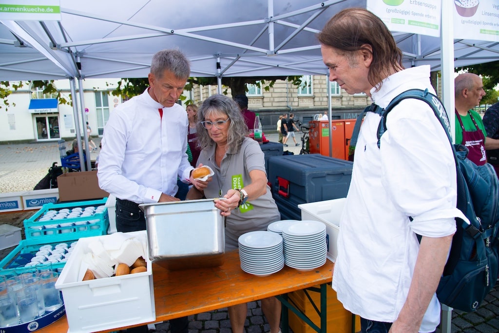 Das Event, das seit Jahren fest im Terminkalender vieler Düsseldorfer*innen steht, lockte Menschen aus allen Gesellschaftsschichten auf den Platz – vom Obdachlosen bis zum Firmenchef. Bürgermeister Josef Hinkel, der als Gast anwesend war, ließ es sich nicht nehmen, spontan bei der Essensausgabe mitzuhelfen. Fast 50 Ehrenamtliche der Altstadt-Armenküche sorgten mit Herz und Engagement für einen reibungslosen Ablauf und eine warme Atmosphäre.