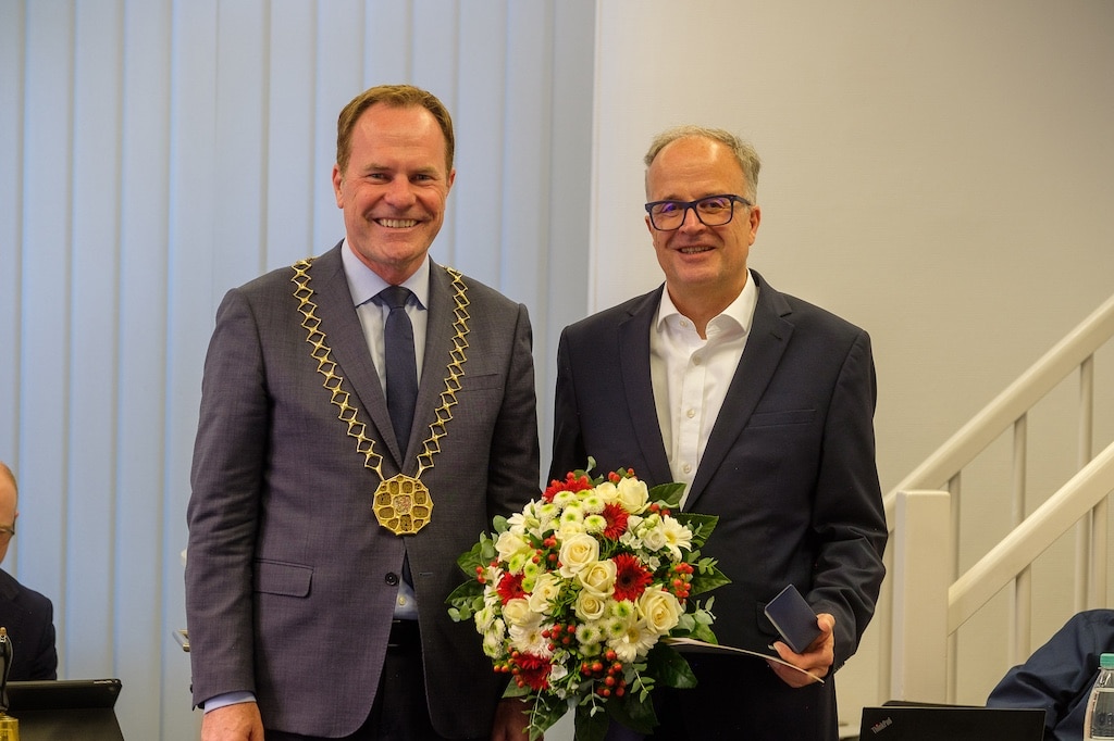 Der Ober­bür­ger­meis­ter Dr. Ste­phan Kel­ler kam am 27. August gern in die Bezirks­ver­tre­tung 05 in das Kai­sers­wert­her Rat­haus, um fünf ver­dien­ten Bezirks­ver­tre­tern und einer Bezirks­ver­tre­te­rin diese Aus­zeich­nung für ehren­amt­li­ches Enga­ge­ment zu überreichen.