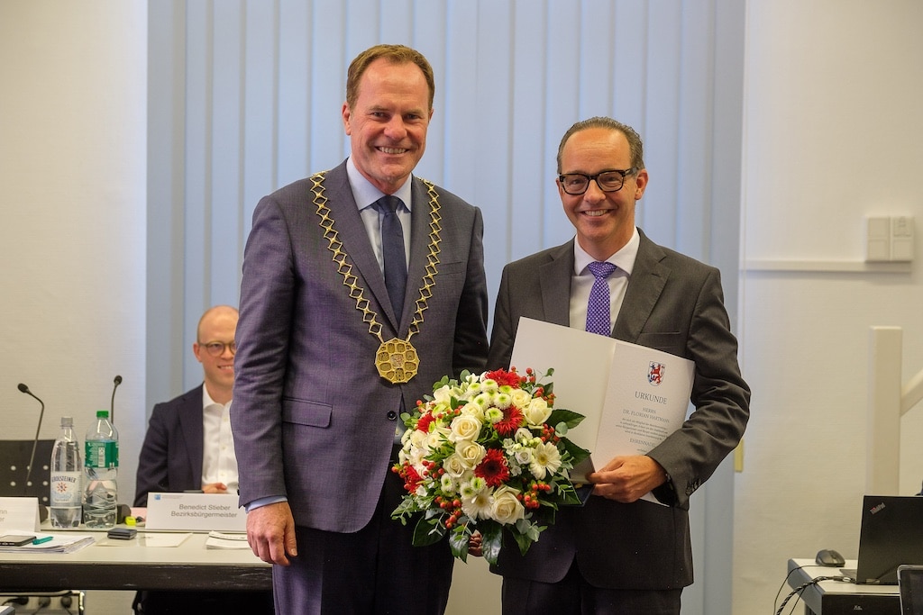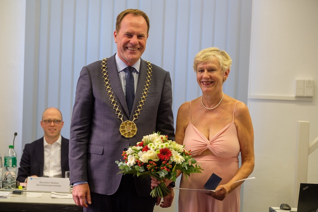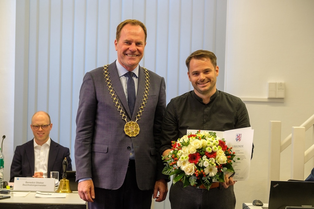 Die Ehren­na­deln samt Urkun­den erhiel­ten Bezirks­bür­ger­meis­ter Bene­dict Stie­ber (CDU), Nor­bert Bier­mann (CDU), Dr. Dr. Mari­anne Hagen (FDP), Dr. Flo­rian Hart­mann (CDU) und Ben­ja­min Tscholl (SPD).