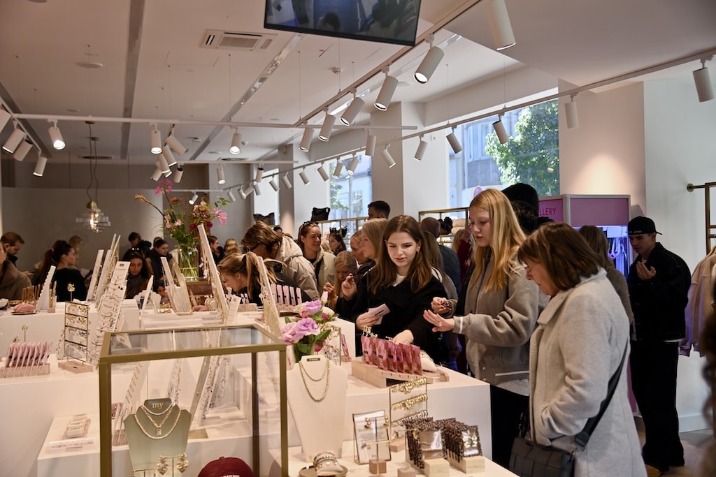 Heute eröffnete das niederländische Schmucklabel My Jewellery seine erste Boutique in Düsseldorf. Schon vor der offiziellen Eröffnung versammelten sich zahlreiche Menschen vor dem Eingang des rund 145 Quadratmeter großen Stores auf der Flinger Straße 25, mitten in der Altstadt. Die mit bunter Ballondekoration geschmückte Fassade und das einladende Design im Inneren der Boutique, mit edlem Fischgrätparkett, hellen Flächen, indirekter Beleuchtung und goldenen Details, schufen eine positive und stilvolle Atmosphäre.