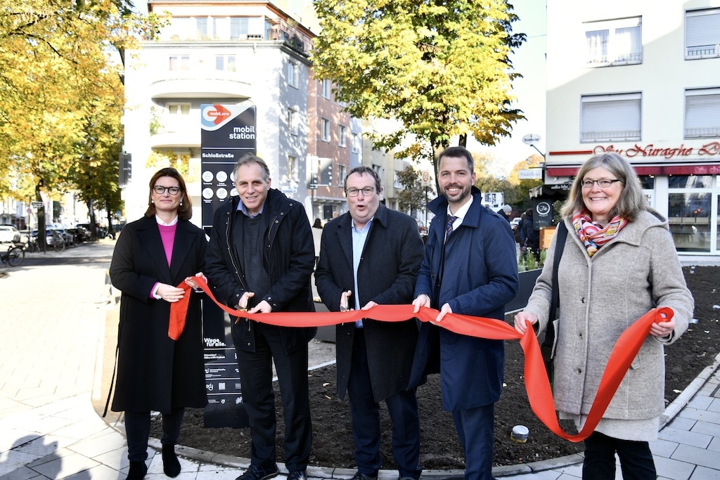 Band­durch­schnitt zur Eröff­nung der Mobi­li­täts­sta­tion an der Schloß­straße mit: Char­lotte Beis­sel, Stadt­werke, Mobi­li­täts­de­zer­nent Jochen Kral, Ver­kehrs­mi­nis­ter Oli­ver Kri­scher, Dr. David Rüdi­ger, CMD, und Bezirks­bür­ger­meis­te­rin Annette Klinke © Lokalbüro