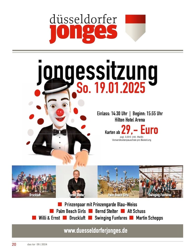Karten für die Jongessitzung sind ab 29 Euro erhältlich und können bei den Düsseldorfer Jonges bestellt werden. Interessierte sollten sich frühzeitig um Tickets bemühen, da die Veranstaltung erfahrungsgemäß schnell ausverkauft ist.