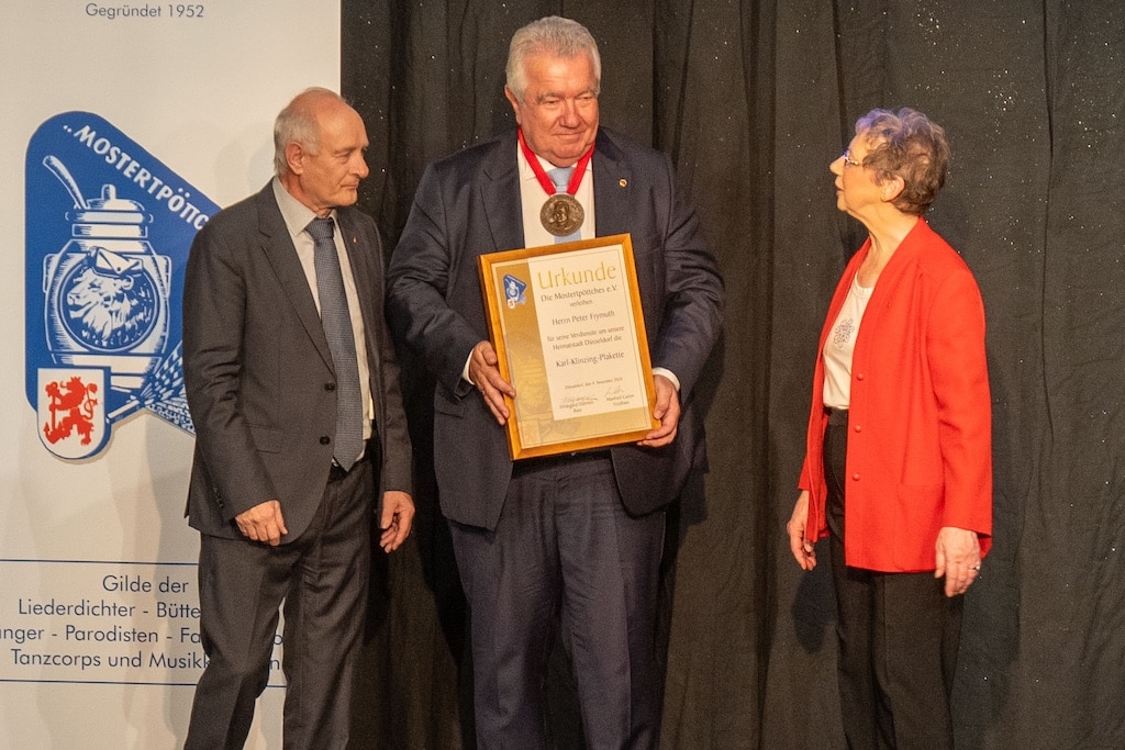 Den Auftakt des Abends bildete eine humorvolle und gleichzeitig bewegende Laudatio, gehalten von den ehemaligen Plakettenträgern Pater Wolfgang Sieffert und Radioreporter Manni Breuckmann. Mit einem Augenzwinkern erzählten sie, dass sie sich die Zustimmung des Publikums erst nach einem kleinen „Bestechungsversuch“ durch Peter Frymuth sicherten, der ihnen im Vorgespräch großzügig Getränke angeboten habe. In ihrer Rede hoben die Laudatoren Frymuths langjähriges Engagement im Fußball sowie seine Verdienste um die Stadt Düsseldorf hervor – von seinen Anfängen als Messdiener bis zu seinem Wirken als Förderer des Sports und der Stadtgesellschaft. Schließlich überreichte die Baas der Mostertpöttches, Hildegard Dahmen, die Karl-Klinzing-Plakette an Frymuth, während Vize-Baas Manfred Castor die dazugehörige Urkunde überreichte.