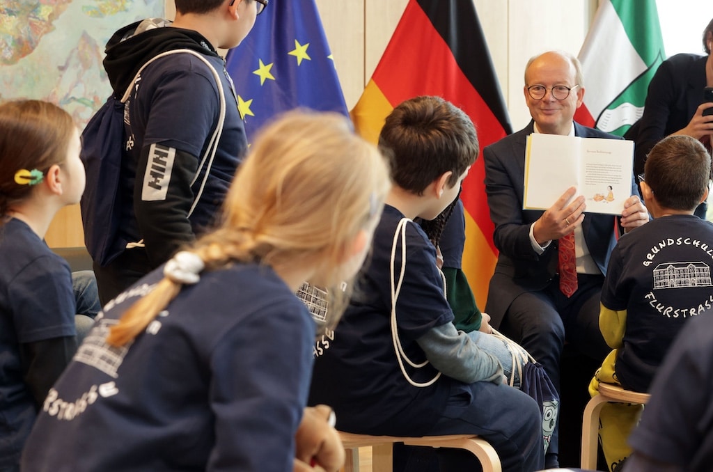Ein beson­de­res Erleb­nis war­tete heute Vor­mit­tag auf die Grund­schul­kin­der der Flur­straße in Düs­sel­dorf. Im Emp­fangs­raum des Land­tags von Nord­rhein-West­fa­len las der Prä­si­dent des Land­tags, André Kuper, der Klasse eine fes­selnde Geschichte vor. Anlass war der bun­des­weite Vor­le­se­tag, der in die­sem Jahr unter dem Motto „Vor­le­sen schafft Zukunft!“ stand.