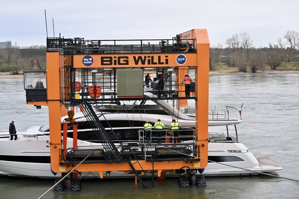 Der erste Arbeitstag für Big Willy im Winter, und schon musste der mechanische Muskelprotz der Messe das Schwergewicht der boot 25 aus dem Rhein hieven. Mit ihren 67 Tonnen und einer Länge von über 26 Metern ist die Princess Y85 das schwerste und größte Schiff, das der Spezialkran zuerst aus dem Rhein hob, um es anschließend auf einen Tieflader zu setzen.