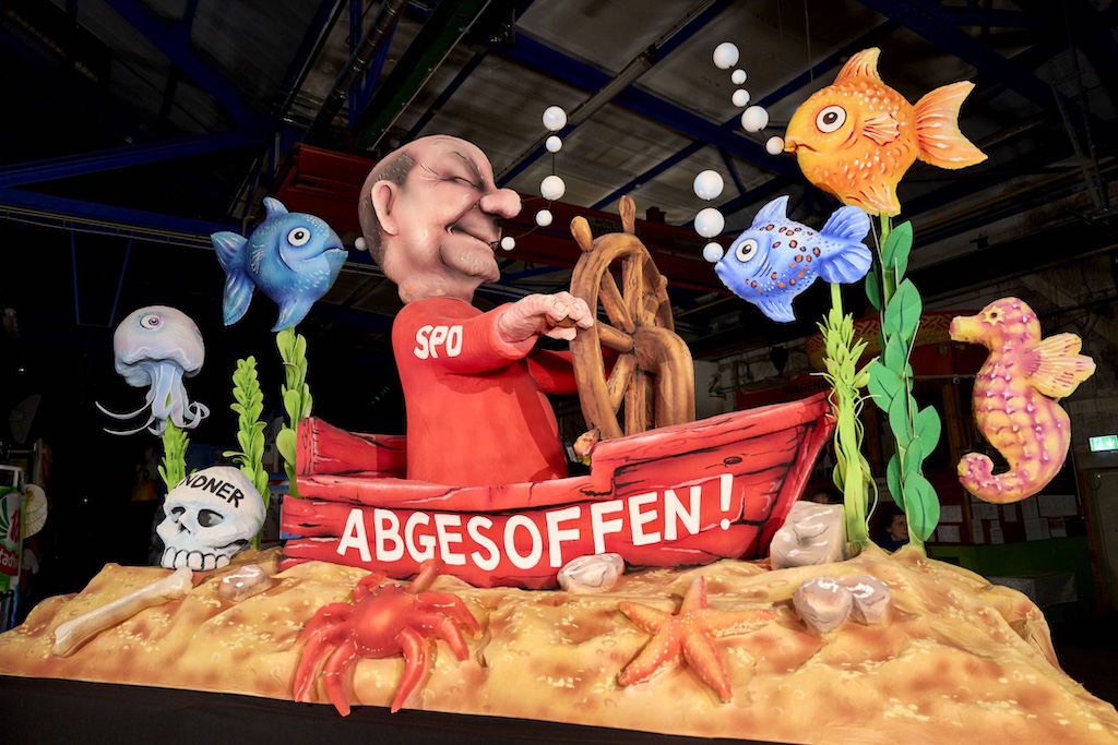 Ein weiterer Motivwagen setzt sich mit dem Wahlergebnis von SPD und FDP auseinander. In einer symbolischen Darstellung wird der scheidende Bundeskanzler gezeigt, wie er mit einem gestrandeten Boot untergeht. Die Beschriftung „Abgesoffen“ unterstreicht die kritische Darstellung des Wahldebakels. Umgeben von Meeresbewohnern wie Fischen und Quallen, verweist die Szene auf das politische Ende des Regierungschefs.