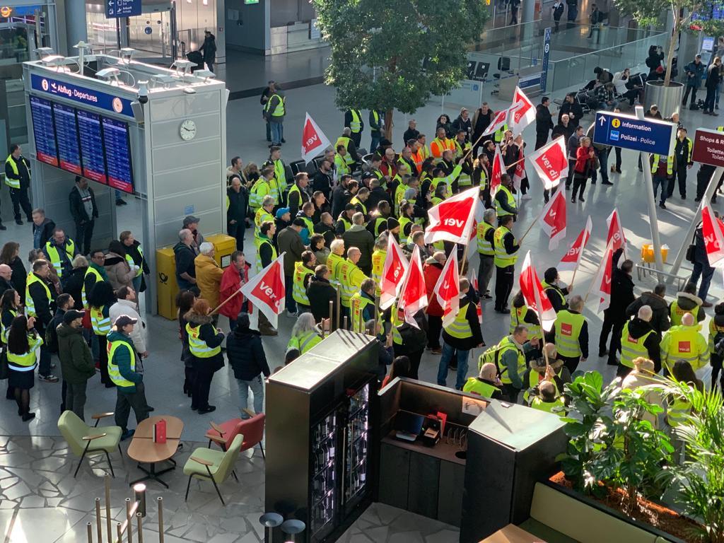 Zum Streik auf­ge­ru­fen sind Beschäf­tigte, die unter den Tarif­ver­trag des öffent­li­chen Diens­tes (TVöD) fal­len, sowie Beschäf­tigte der Boden­ver­kehrs­dienst­leis­ter (Bran­chen­ta­rif­ver­trag). Der Arbeits­aus­stand beginnt je nach Beschäf­tig­ten­gruppe am Mon­tag, 10. März, um 2:00 Uhr bzw. um 3:00 Uhr und dau­ert jeweils 24 Stun­den bis Diens­tag, 11. März, zur glei­chen Uhrzeit.
