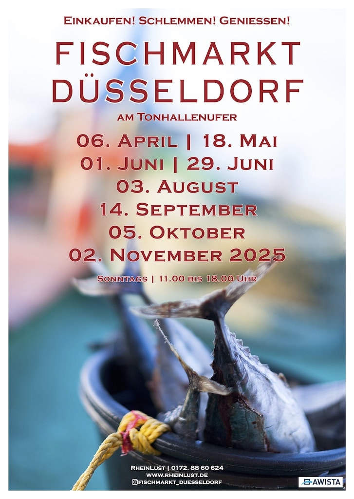 Der beliebte Düs­sel­dor­fer Fisch­markt geht in seine 26. Sai­son und ver­wan­delt das Ton­hal­len­ufer von April bis Novem­ber erneut an acht Sonn­ta­gen in eine Genuss- und Fla­nier­meile. Mit rund 70 Aus­stel­lern bie­tet das Event eine beein­dru­ckende kuli­na­ri­sche Band­breite, die Besu­cher aus ganz NRW und dar­über hin­aus anlockt.