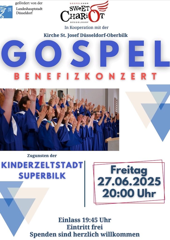 Der Gospelchor Sweet Chariot e.V. gibt am 27. Juni 2025 um 20:00 Uhr ein Benefizkonzert in der Kirche St. Josef am Josefsplatz in Düsseldorf. Der Eintritt ist frei, Spenden zugunsten des Projekts „Superbilk“ sind herzlich willkommen.