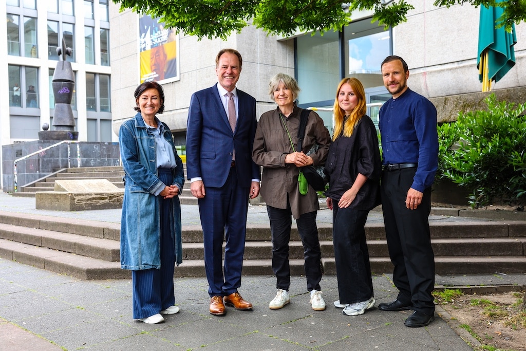 Im Vor­feld der Ver­lei­hung kamen (v. l.) Miriam Koch, Dezer­nen­tin für Kul­tur und Inte­gra­tion, Ober­bür­ger­meis­ter Dr. Ste­phan Kel­ler, die Preis­trä­ge­rin Ursula Schulz-Dorn­burg, Ali­cia Holt­hau­sen, kom­mis­sa­ri­sche Künst­le­ri­sche Lei­te­rin der Kunst­halle, sowie Ste­phan Macháč, Koor­di­nie­rungs­stelle Foto­gra­fie im Düs­sel­dor­fer Kul­tur­amt, zu einem Pres­se­ge­spräch zusam­men © Lan­des­haupt­stadt Düsseldorf/Melanie Zanin