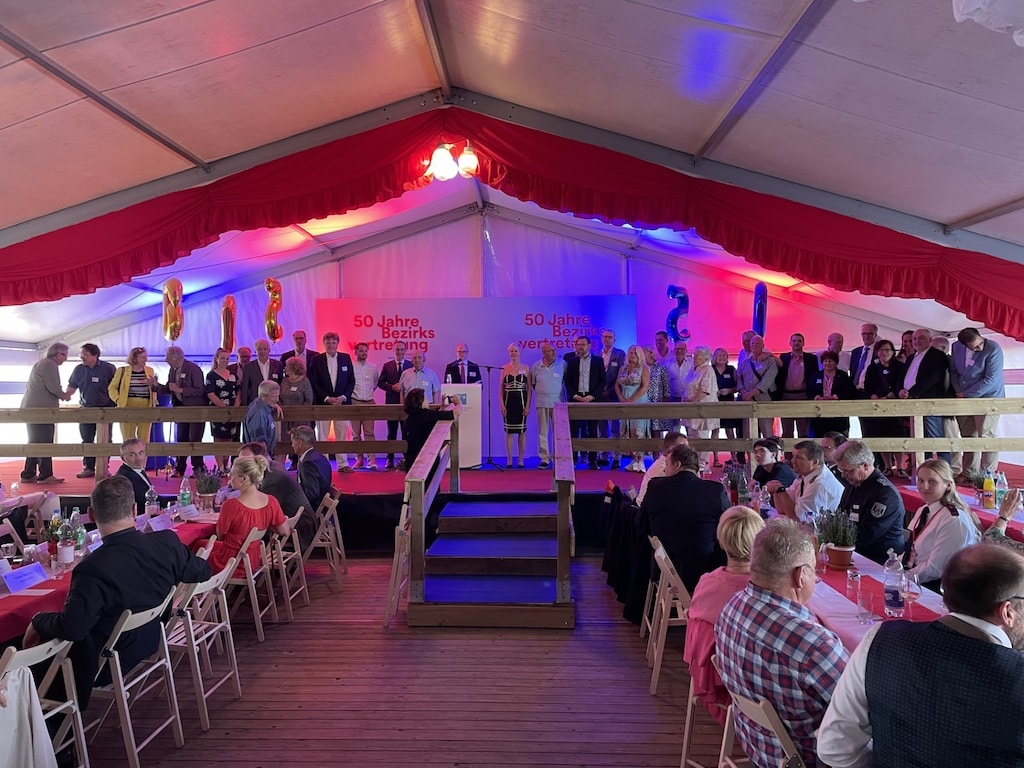 Nach Stiebers Angaben waren in der BV5 seit ihrer Gründung insgesamt 91 Bezirksvertreterinnen und Bezirksvertreter aktiv. „Auch heute noch sind viele von Ihnen mit uns verbunden.“ Als besondere Geste bat der Bezirksbürgermeister alle anwesenden aktiven und ehemaligen Mandatsträgerinnen und Mandatsträger auf die Bühne.