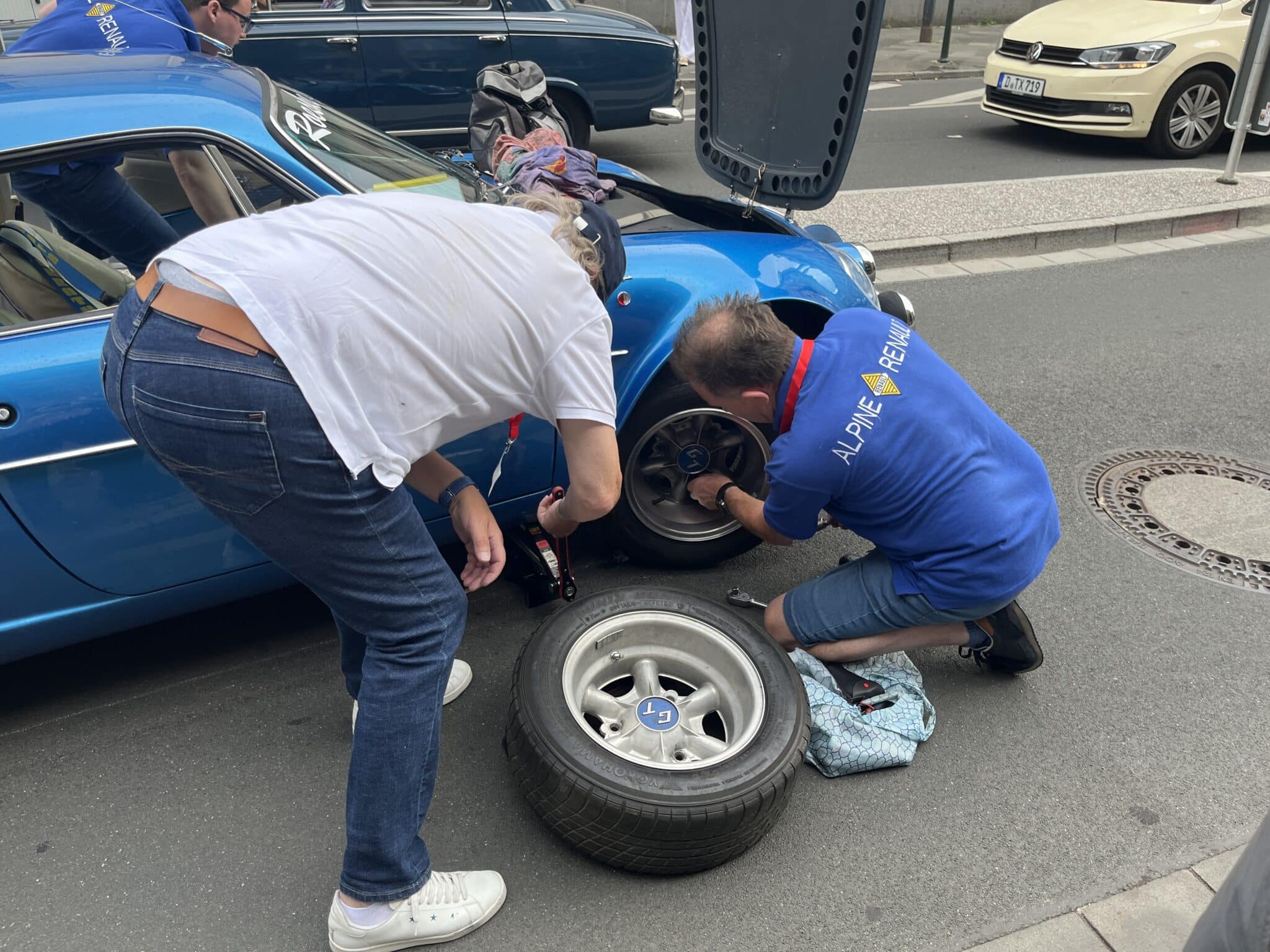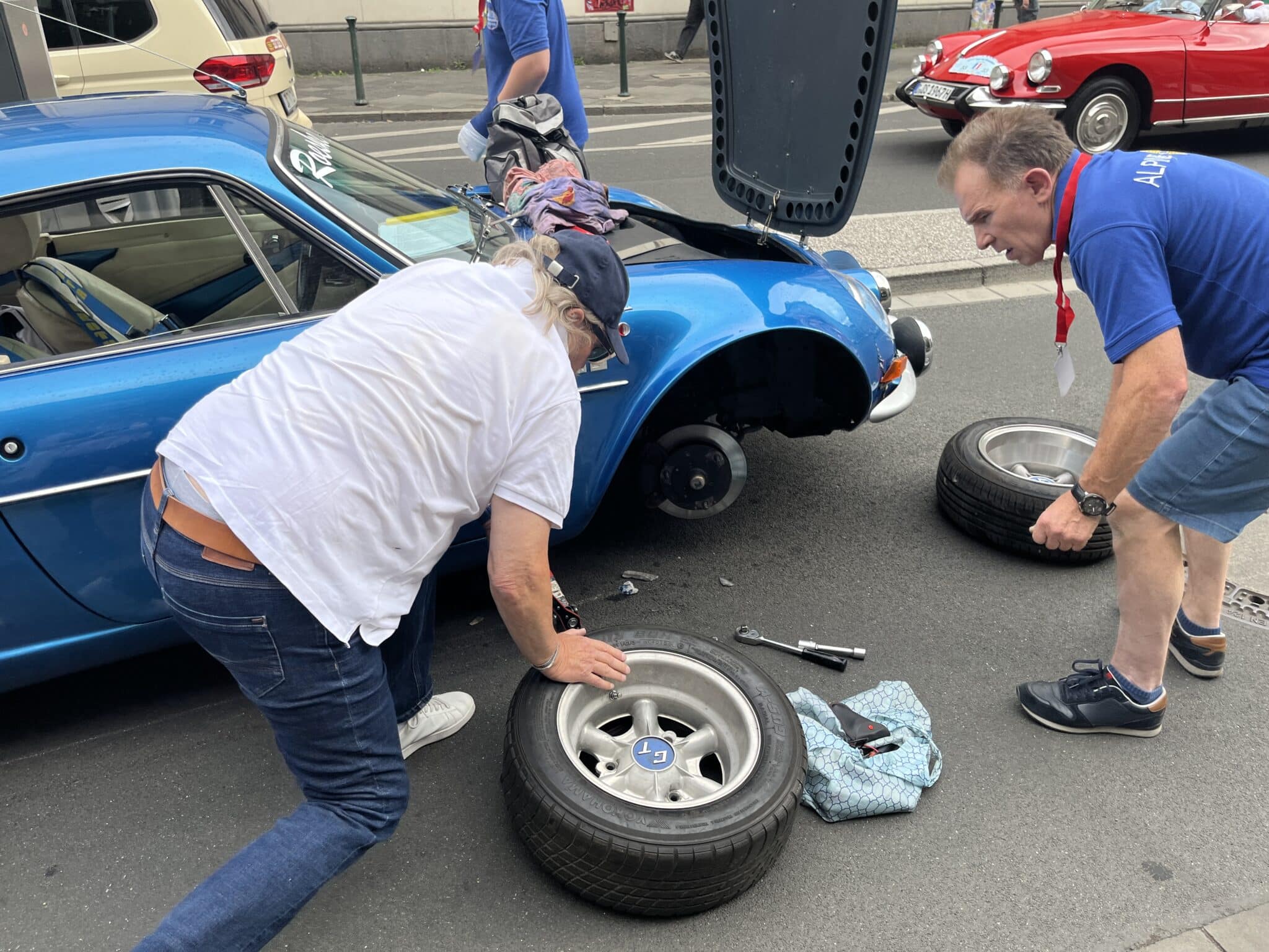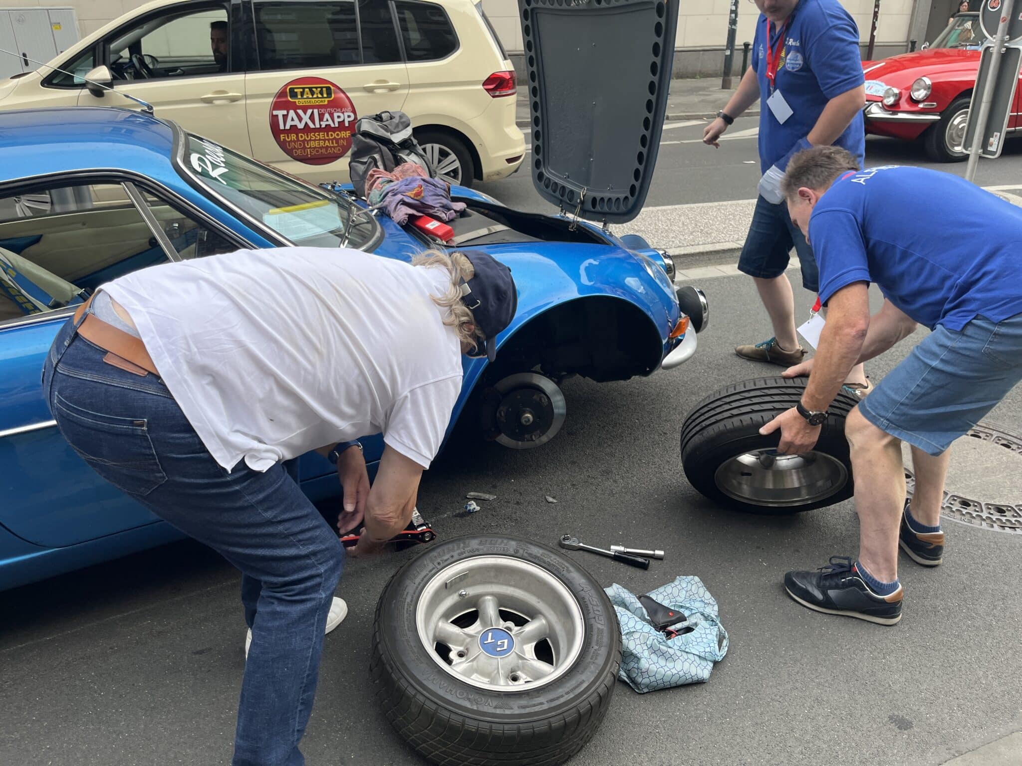 „Der rechte Vorderreifen ist defekt, Spurstange und Achse ebenso“, diagnostiziert Roeske auf den ersten Blick. Damit der Unterboden nicht über den Asphalt schleift, wird schnell noch ein Reifen gewechselt. Trotzdem ist das Fahrzeug nicht mehr zu lenken und wird erst einmal zur Seite geschoben. Es wartet auf den Abschleppwagen.