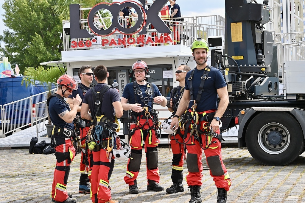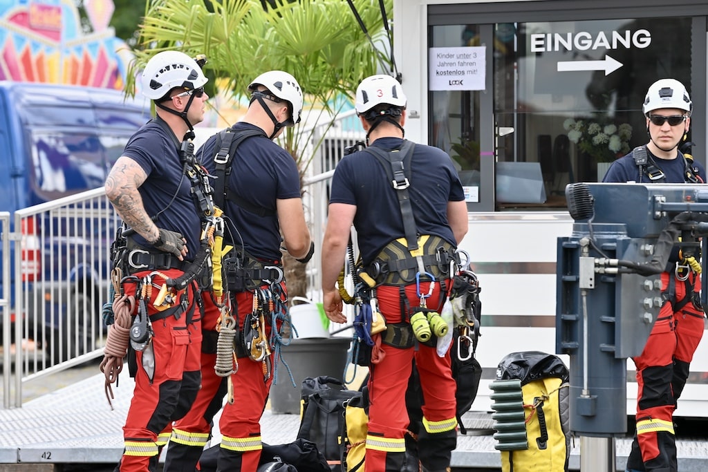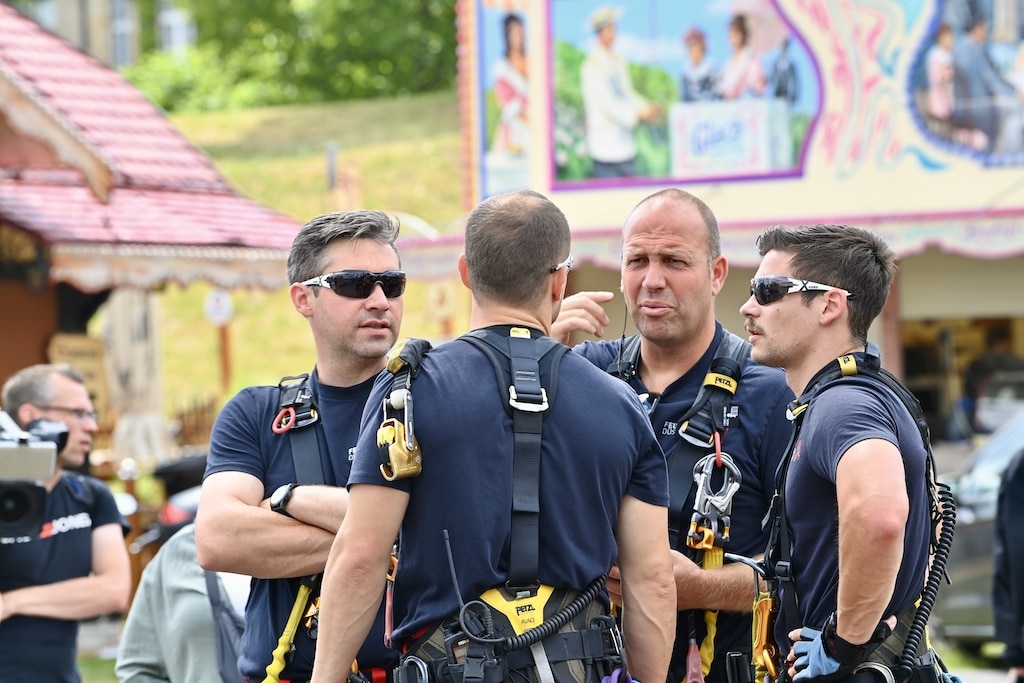 Schon Tage vor der offiziellen Eröffnung trainieren die Höhenretter der Feuerwehr den Ernstfall. Wenn sich Gondeln in schwindelerregender Höhe festsetzen oder eine technische Störung eintritt, zählt jede Sekunde. Weil herkömmliche Rettungsfahrzeuge wie die Drehleiter nur begrenzt einsetzbar sind, übernehmen speziell geschulte Einsatzkräfte die Aufgabe, Personen aus bis zu 80 Meter Höhe sicher zu Boden zu bringen. Dieses Training hat Tradition und findet jährlich direkt an den aufgebauten Fahrgeschäften statt – eine Maßnahme, die Sicherheit schafft und im Ernstfall wertvolle Zeit spart.