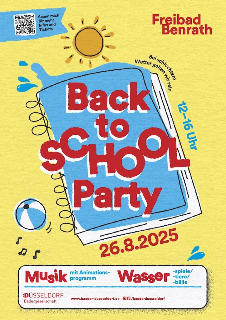 Mit einer bunten Back-to-School-Party verabschiedet die Bädergesellschaft Düsseldorf am Dienstag, 26. August 2025, die Sommerferien im Freibad Benrath. Von 12 bis 16 Uhr sind Kinder, Jugendliche und Familien eingeladen, den letzten Ferientag mit Spiel, Spaß und Musik zu verbringen.