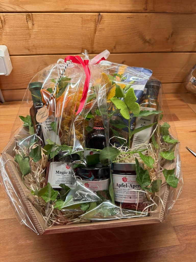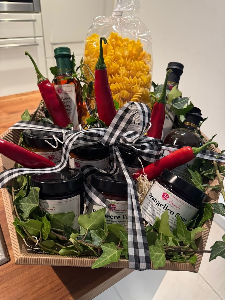 Geschenkkörbe gibt es bei Ferdinand Kaufmann ebenfalls. Und außer Marmeladen und Gelees stellt er noch viele weitere Delikatessen her – etwa Rotwein-Zwiebel-Chutney, Birnen-Balsam, Essig mit Himbeere, Zitrone und Brombeere.